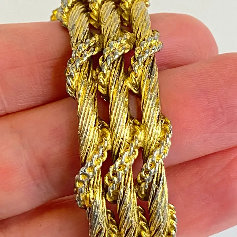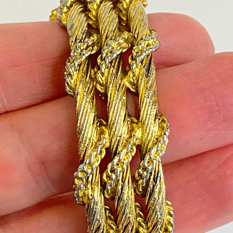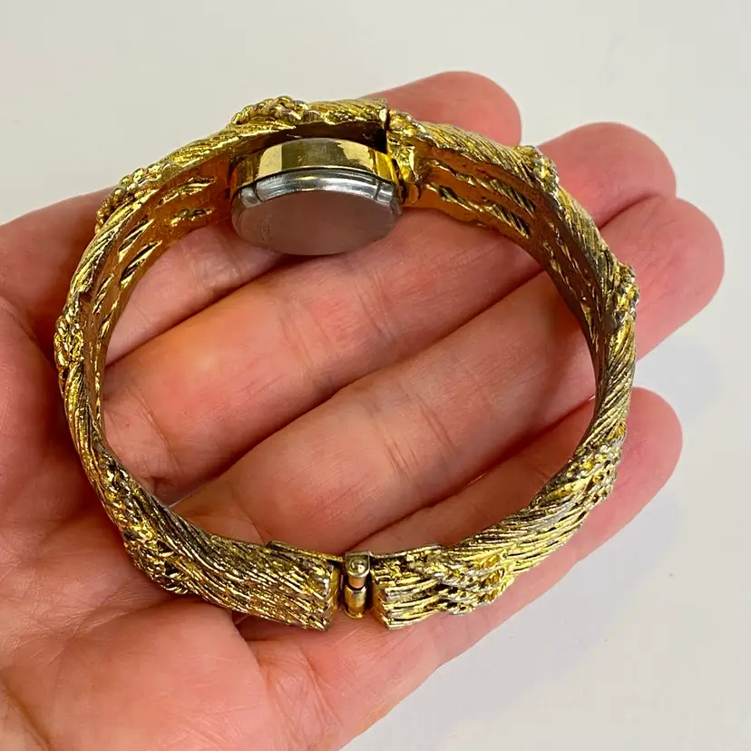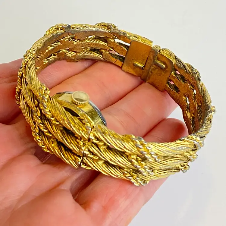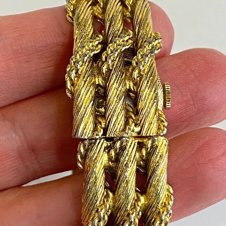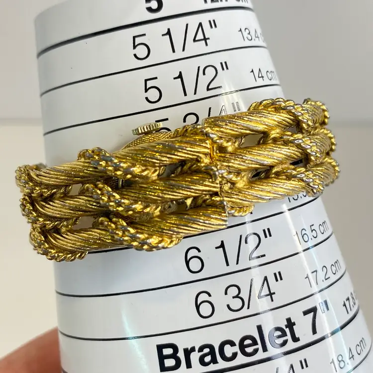 Crafted with a gold-tone base metal bracelet featuring an intricate rope-twist textured pattern, this watch is a clamper bracelet and has a stainless steel back. Mechanical hand-wind movement with 17 jewels is indicative of quality Swiss craftsmanship from the 1960s–1970s. Inner circumference measures approximately 6 1/2 inches, ideal for a small wrist.