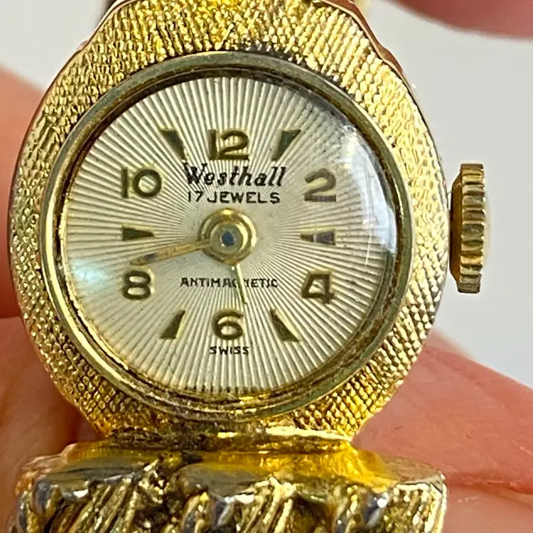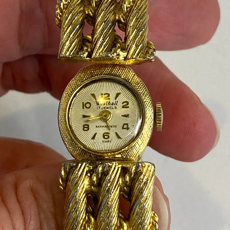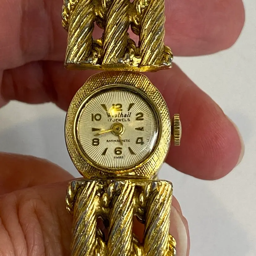 Tags: #VintageWatch #SwissWatch #WesthallWatch #HiddenDialWatch #17Jewels #LadiesWatch #GoldToneWatch #RopeBraceletWatch #AntimagneticWatch #CollectibleWatch