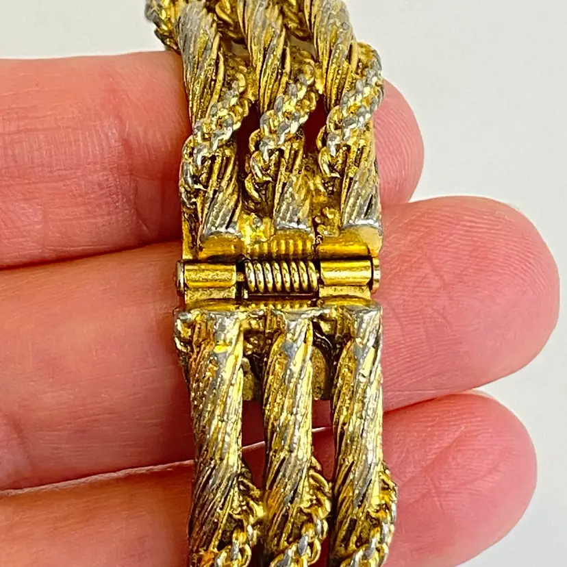 Vintage Westhall Swiss 17 Jewel Ladies Hidden Dial Bracelet Watch Gold Rope Design. This stunning mid-century Swiss timepiece combines the elegance of fine jewelry with the precision of watchmaking. The concealed round dial is hidden beneath a hinged bracelet segment, revealing a gold-tone face marked “Westhall,” “17 Jewels,” “Antimagnetic,” and “Swiss,” with raised Arabic numerals and matching gold-tone hands.