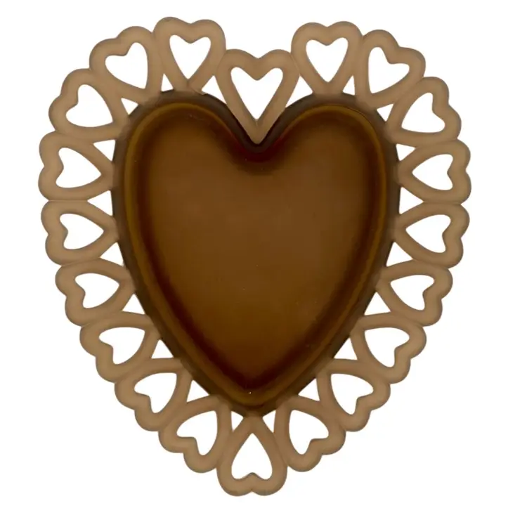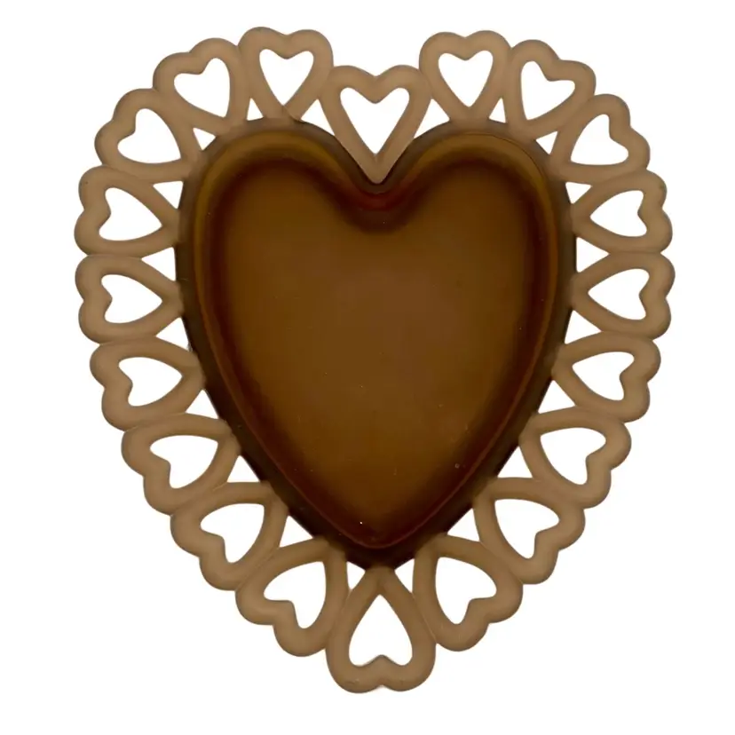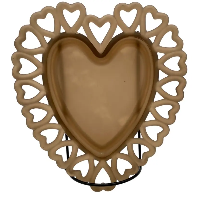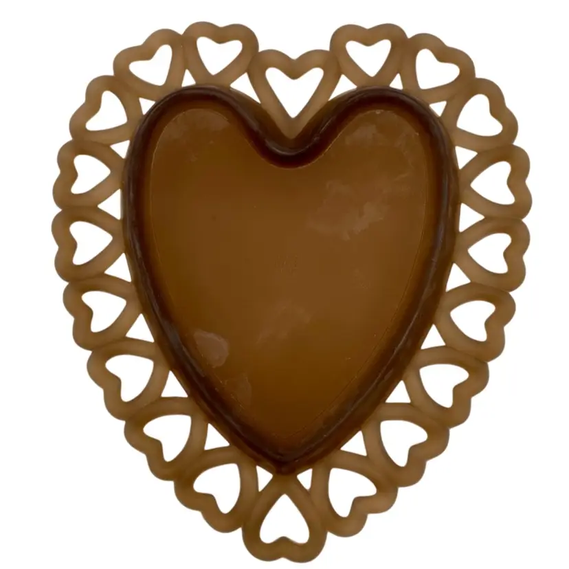 This vintage Westmoreland Glass Chocolate (Brown Mist) Heart-Shaped Dish is a charming decorative piece and perfect especially for Valentine's Day. Westmoreland made their Brown Mist glass line in the 1970s, a decade prior to their closing. It has clean lines and a beautiful satin glass finish. The heart-shaped dish features reticulated hearts for the edging and comes as manufactured (no decoration). With dimensions of 8.1 inches in length, 7.1 inches in width, and 0.6 inches in height, this dish weighs 13.3 ounces. It would work beautifully as a trinket dish, candy dish, or as a decor piece.