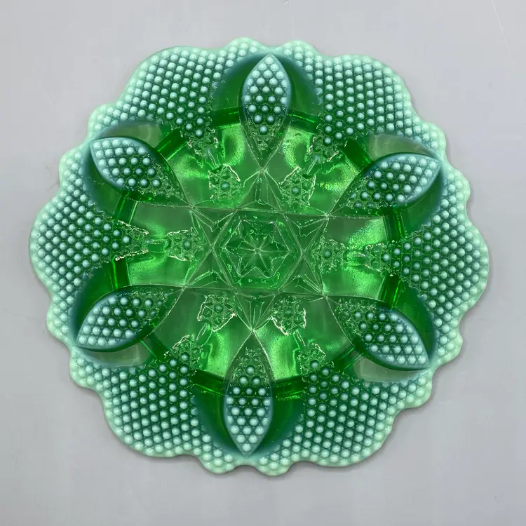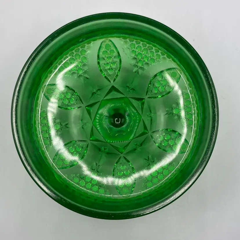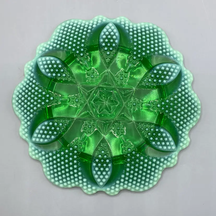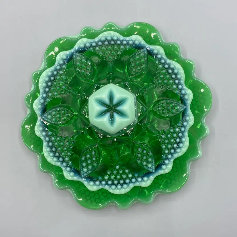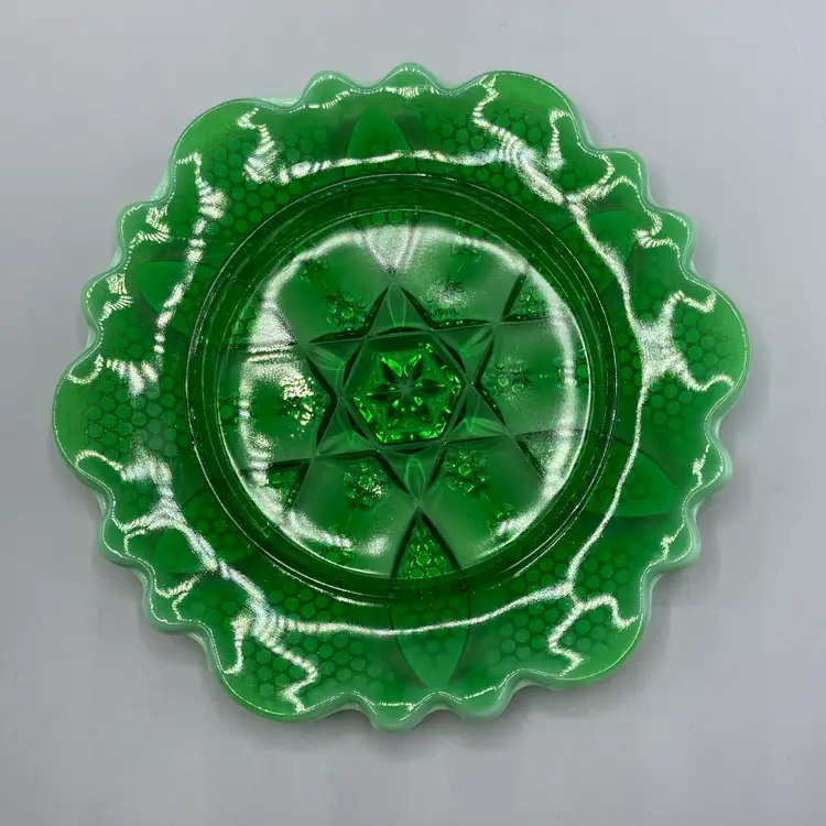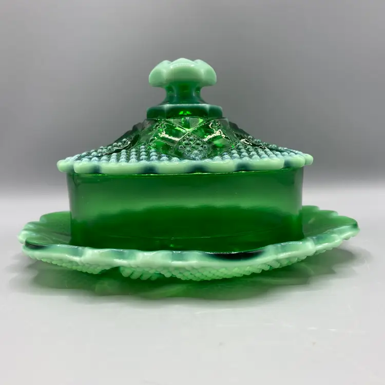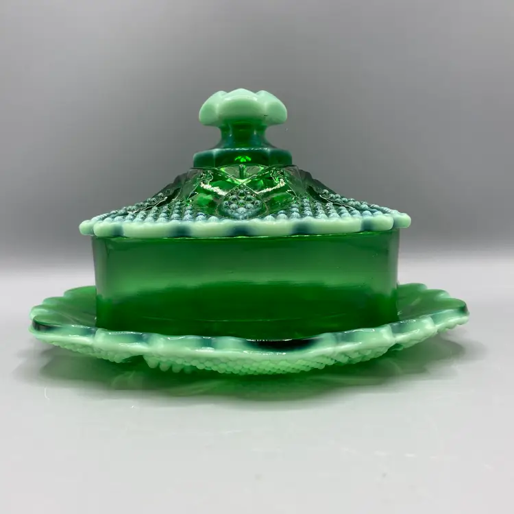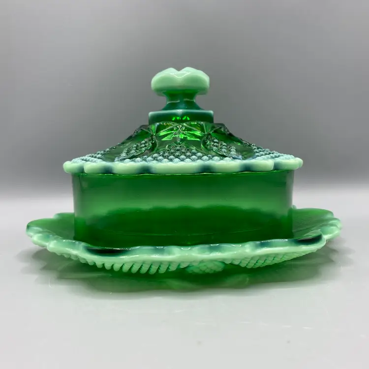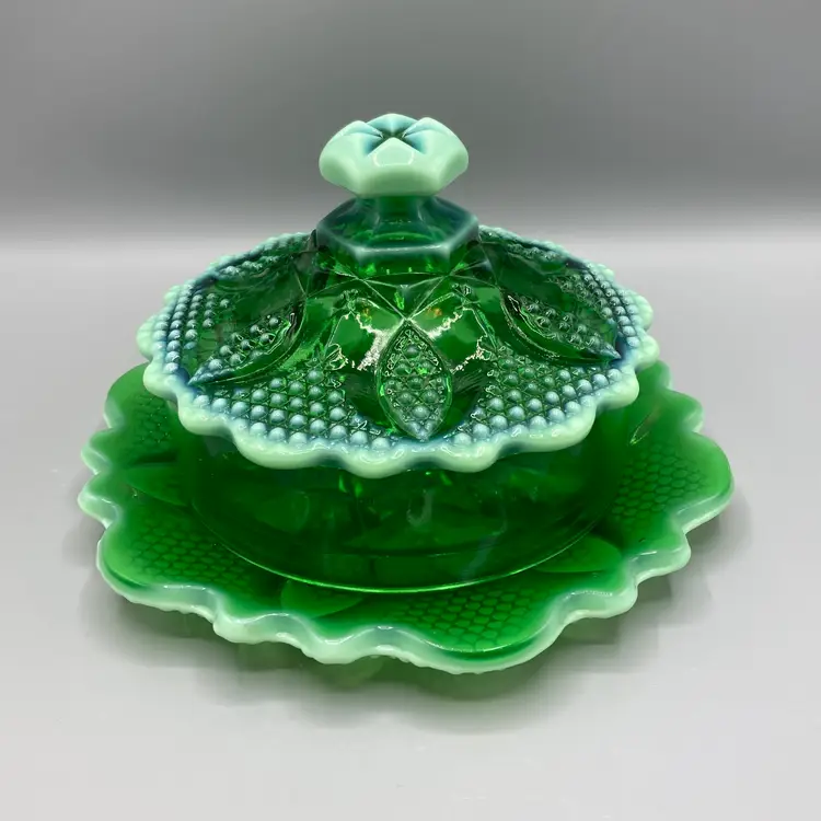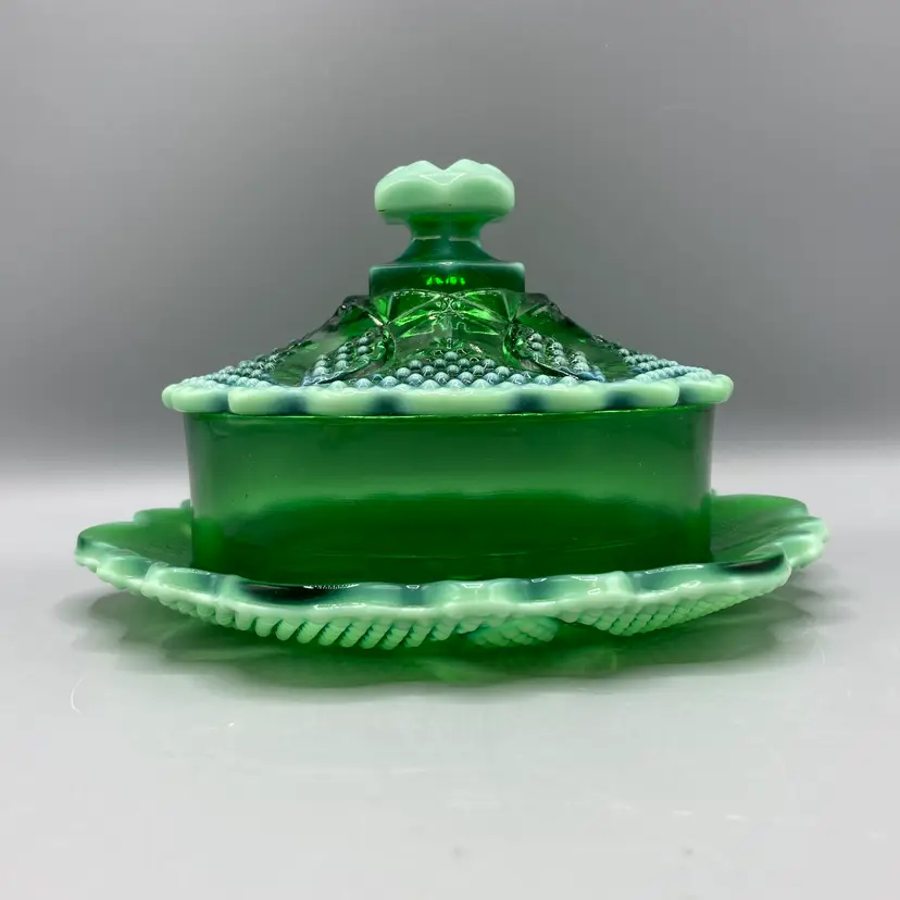 This butter / cheese dish is in good condition, please see pictures for specific details. It measures approximately 7 1/2" across the base plate and 5 1/2" across the top. It is approximately 4 1/4" tall.