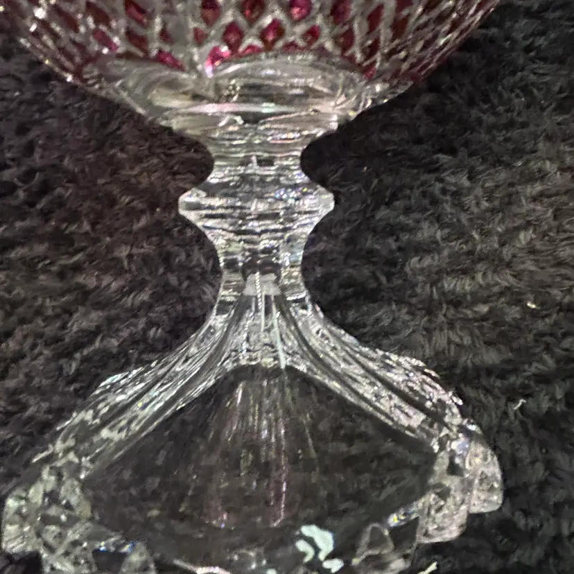 Technique: The red color is likely achieved through staining or flashing, where a thin layer of colored glass (often using sulfate copper or gold salts) is applied over clear lead crystal.