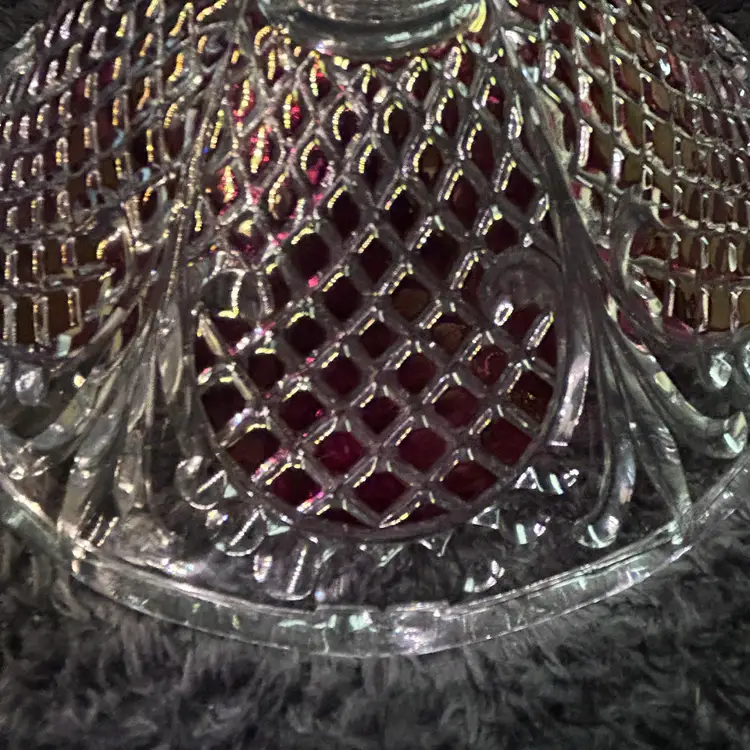 Pattern: The diamond-cut texture with red accents is characteristic of patterns like "Waterford" (also known as "Wakefield") produced by the Westmoreland Glass Co. between approximately 1950 and 1981.