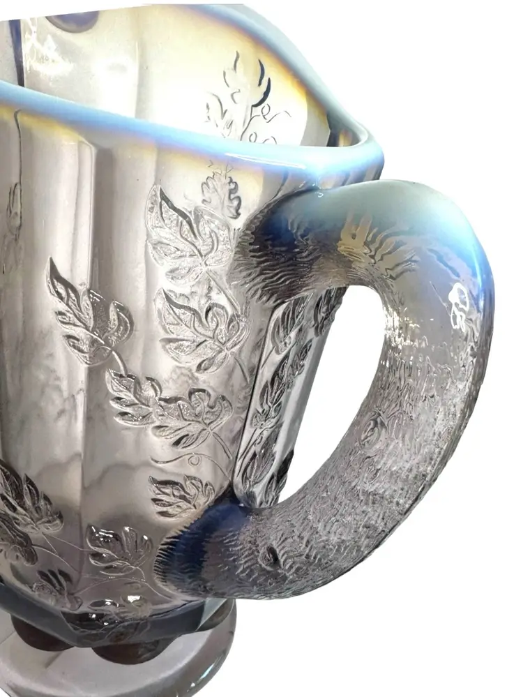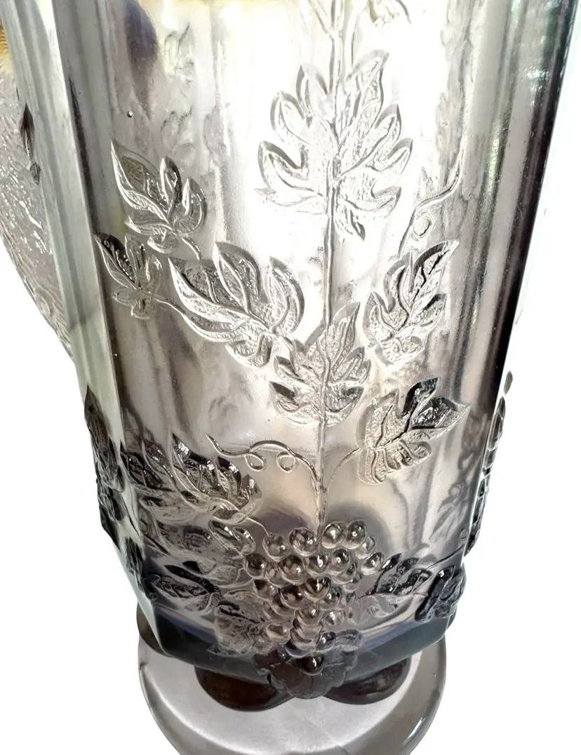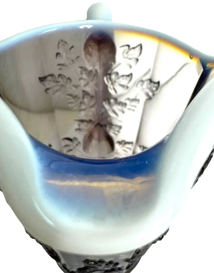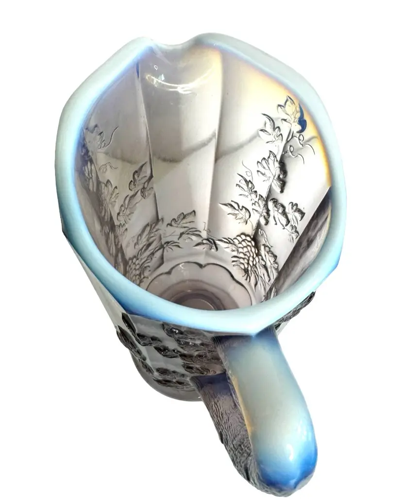 Vintage westmoreland lilac /dusty purple opalescent pitcher with raised botanical and grape pattern as well as a texture applied handle. Limited edition. Beautiful condition with very minimal wear. No cracks. Tiny small rough spot on handle.