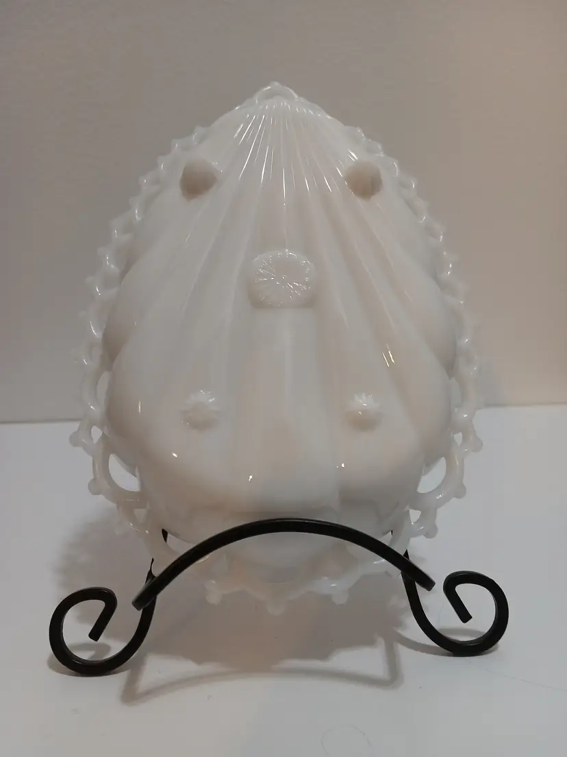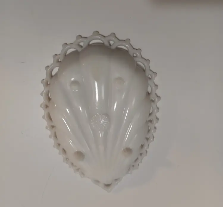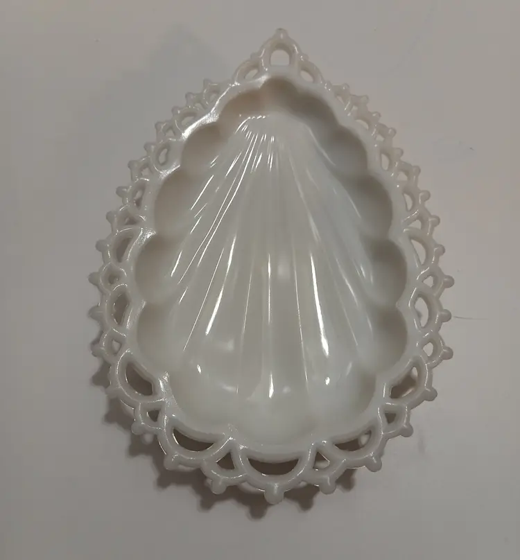Very Pretty Westmoreland Milk Glass Dish; Opalescent Lacey Lattice Edge Surrounds The Scalloped Interior; Very Nice Condition! No Chips or Cracks; 7.25" L x 5" W x 1" D; Westmoreland Mark on Base
