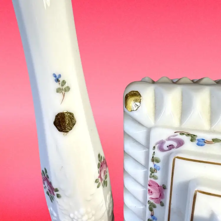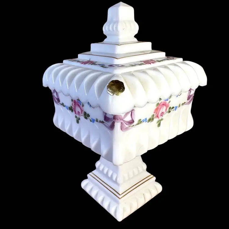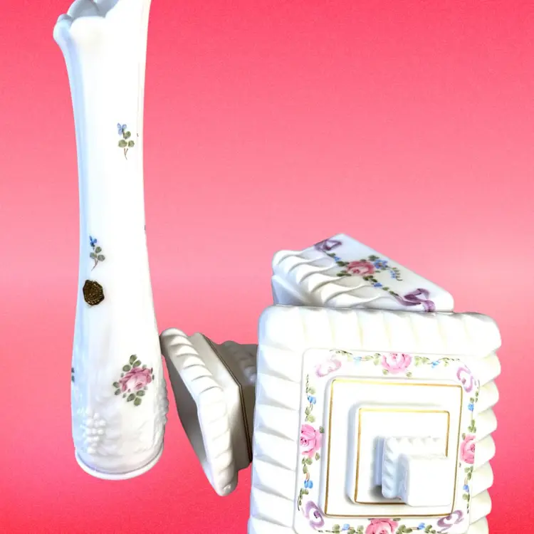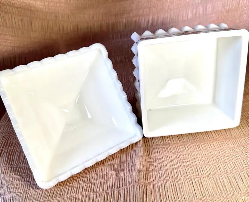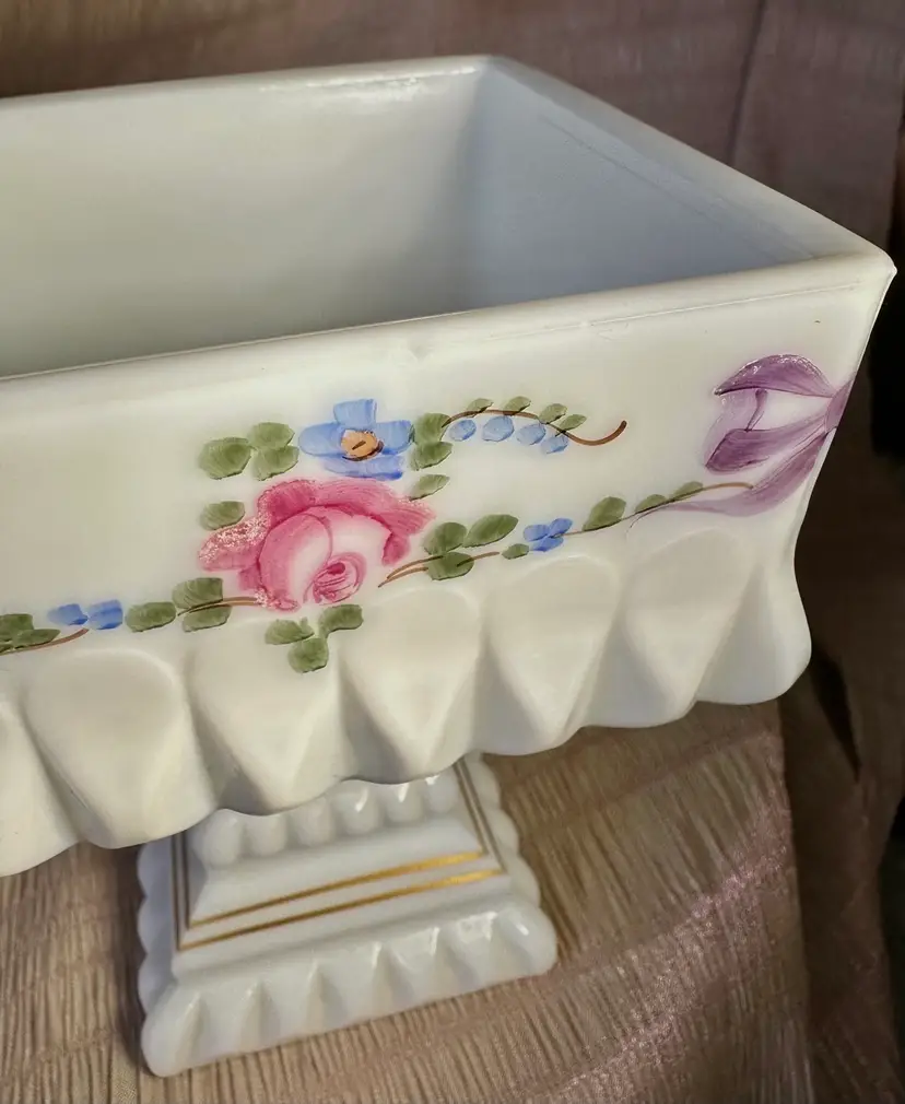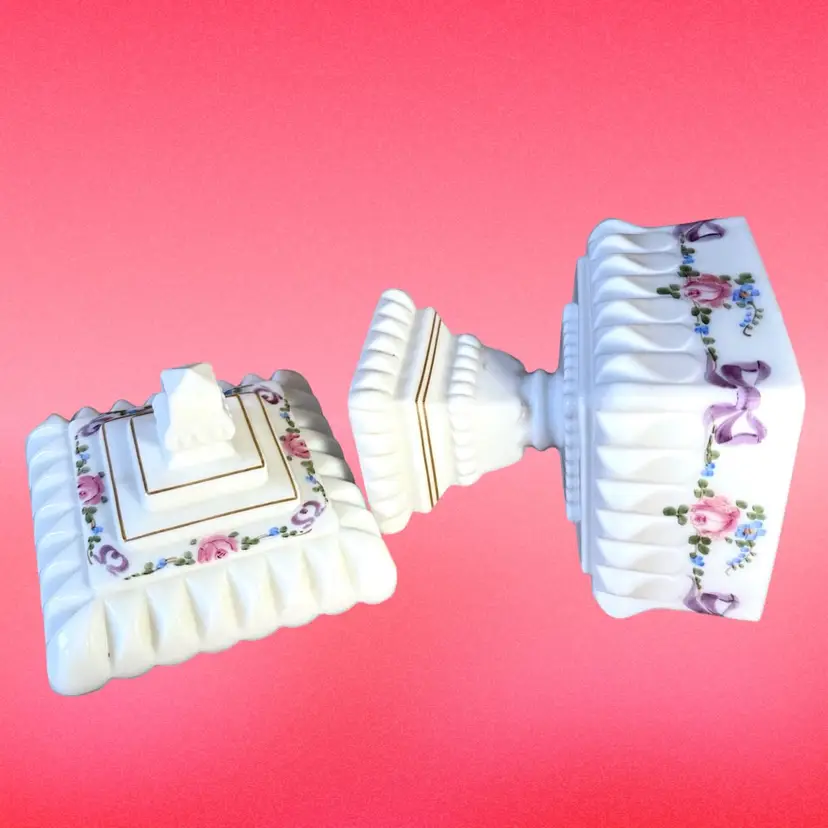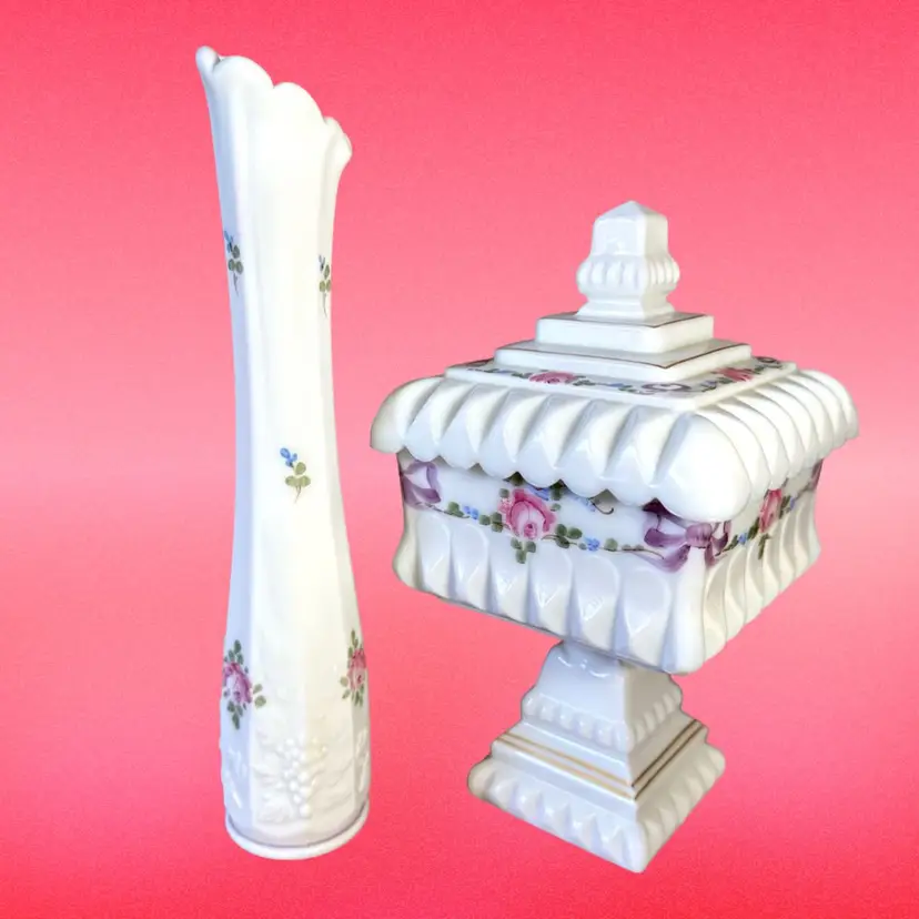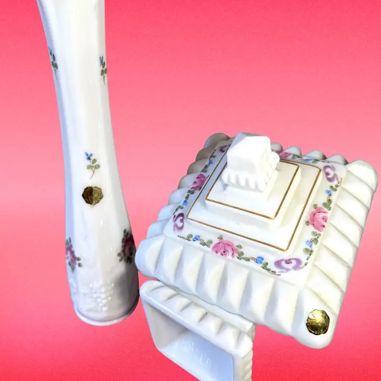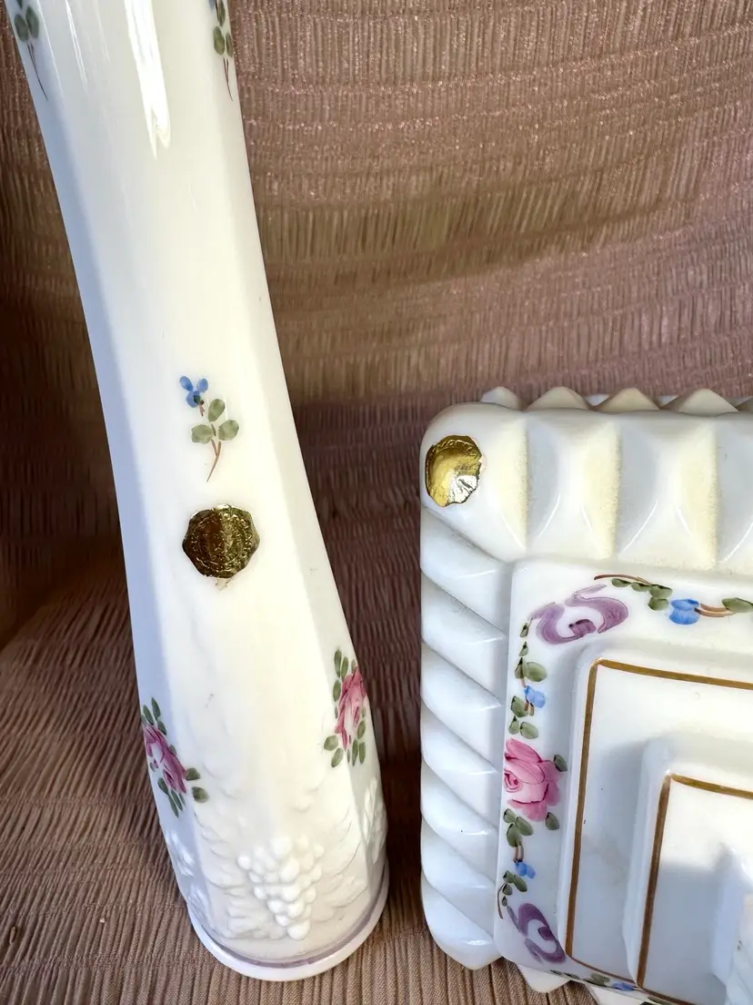 Set of 2 items that match - candydish with lid or wedding cake stand inverted and a bud vase🌸. Westmoreland stickers on both🌸 Tiny tiny nick on edge of top of cake stand /candy dish