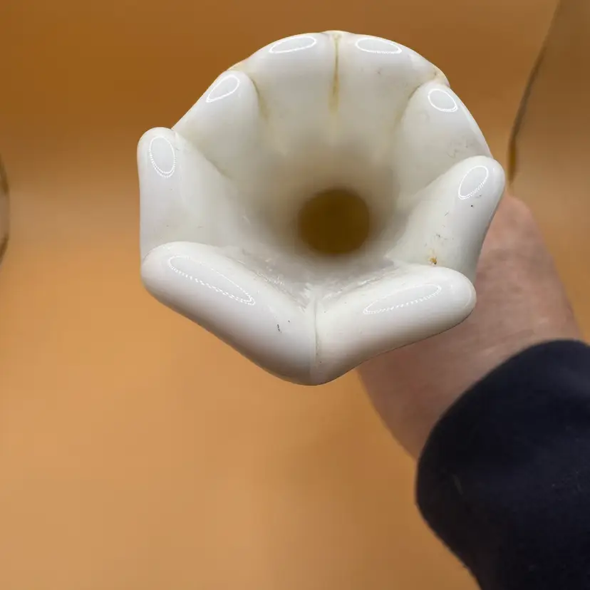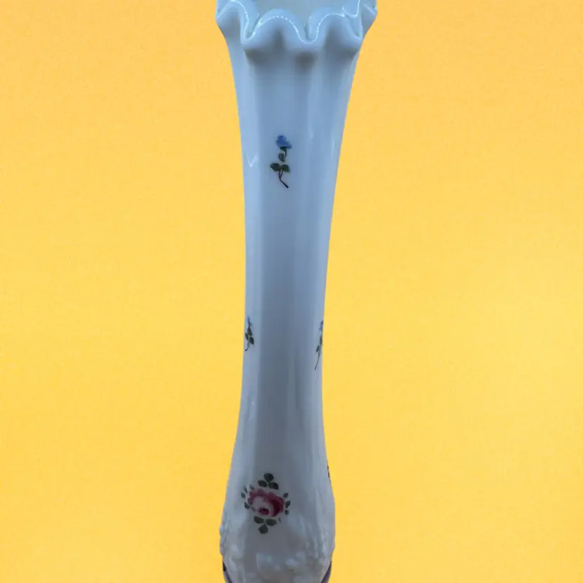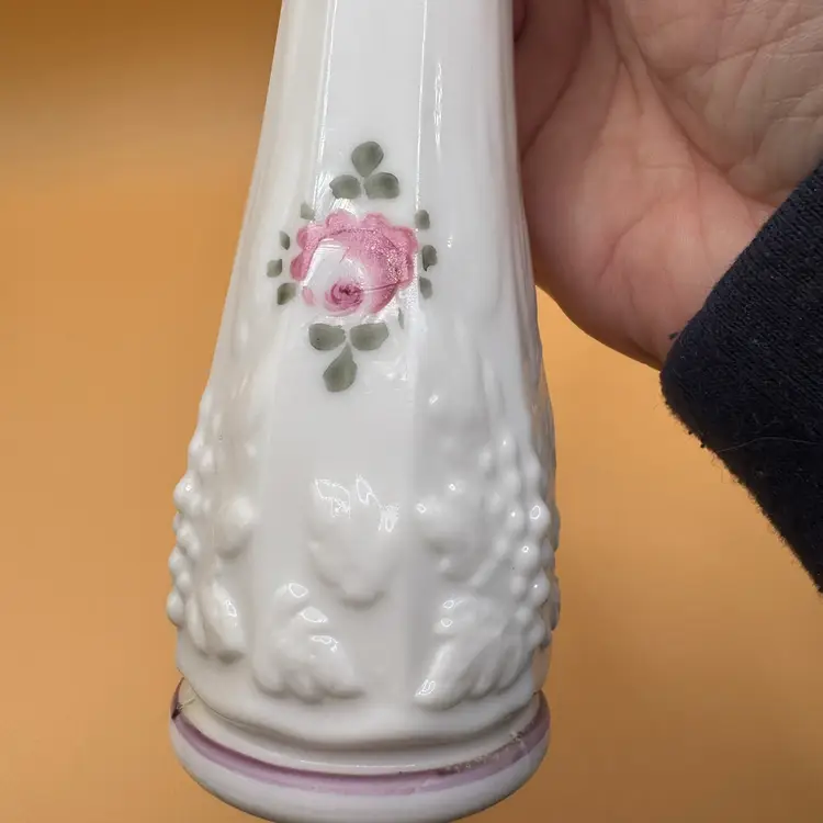 vintage Westmoreland milk glass bud vase featuring a tall, flared shape with a scalloped rim and a base textured with a grape and leaf pattern