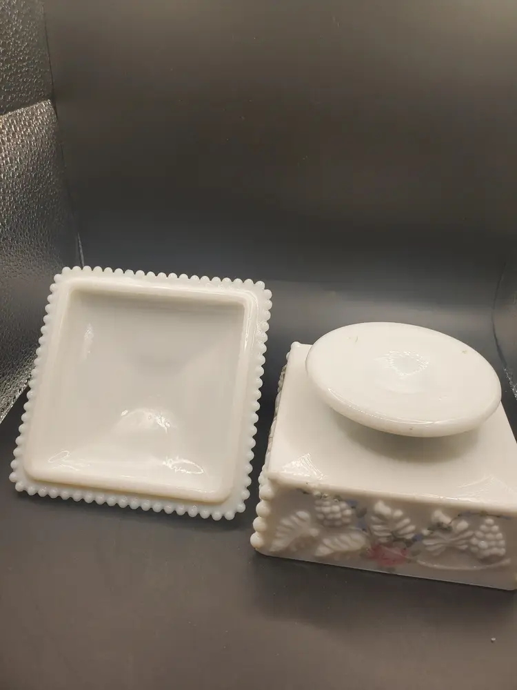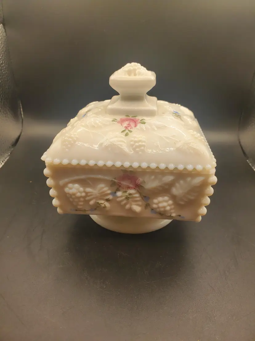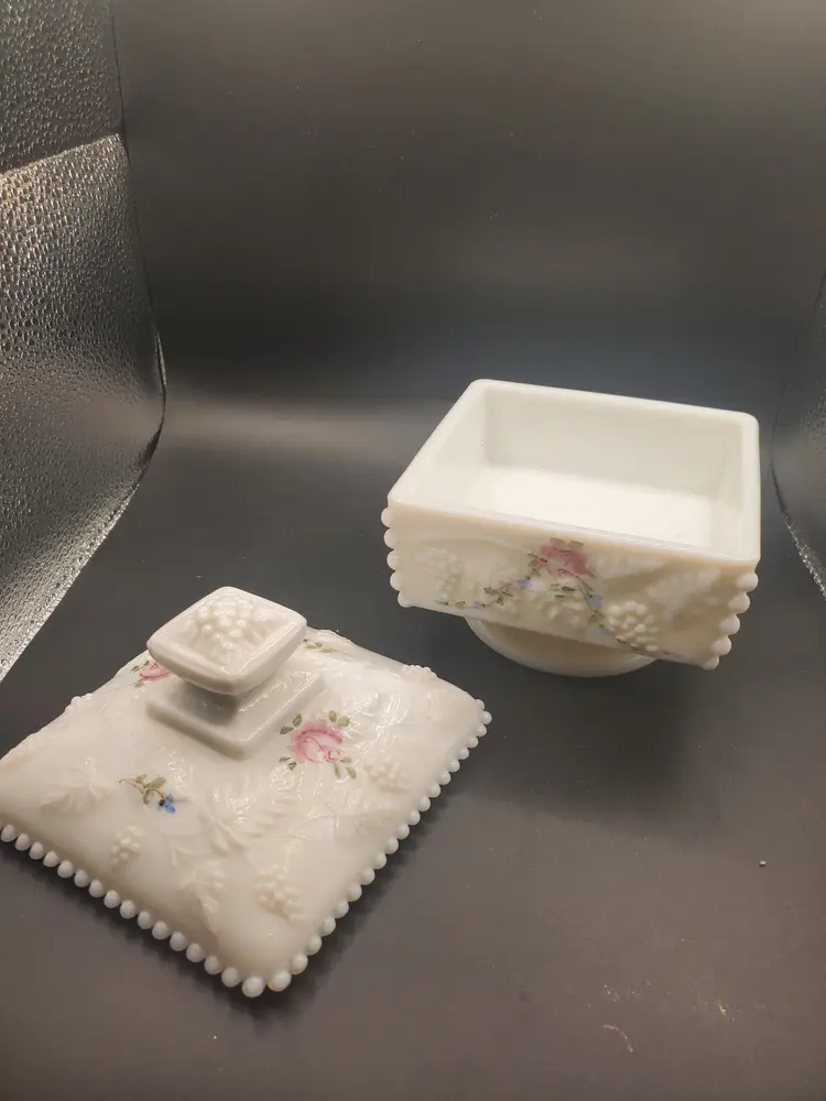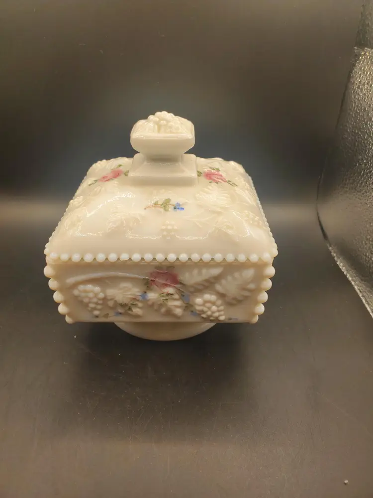 Pretty white milk glass covered dish. Handpainted florals. No chips or cracks. 5" square