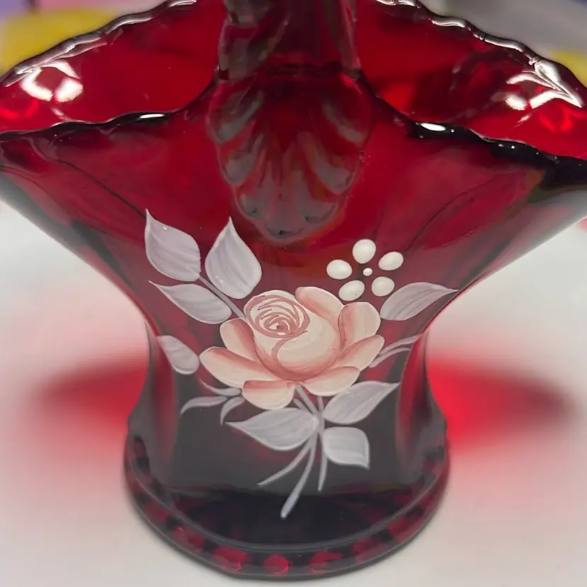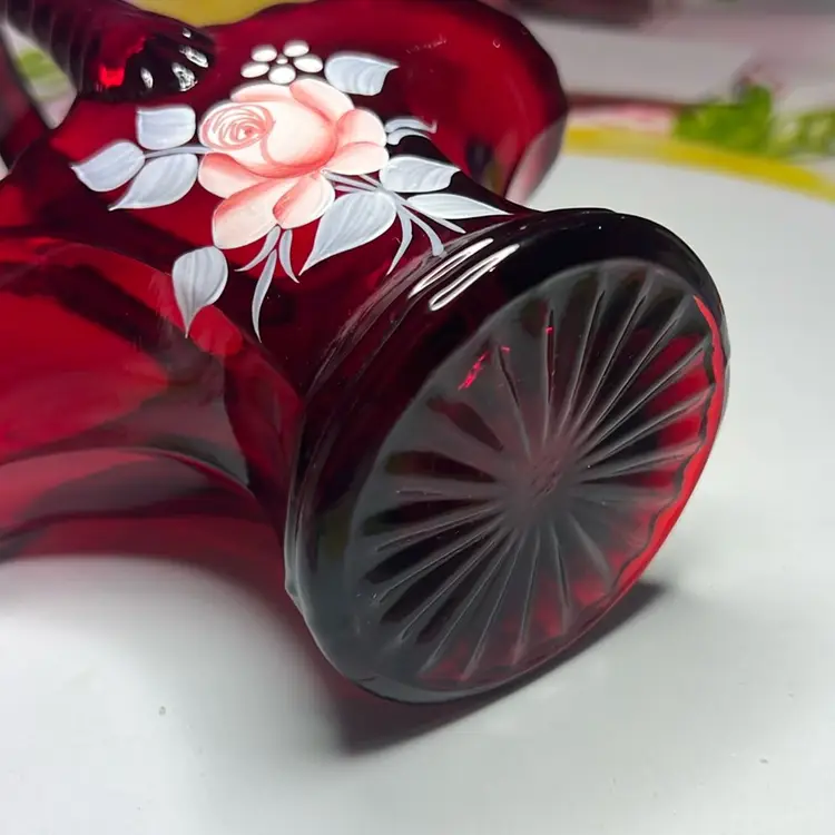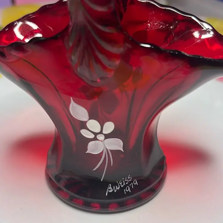 Hand painted & signed by artist (Weiss) made in 1979. Beautiful pink rose on front and small white flower on back side. Measures 7” tall & 4.5” wide - no chips or cracks in excellent condition