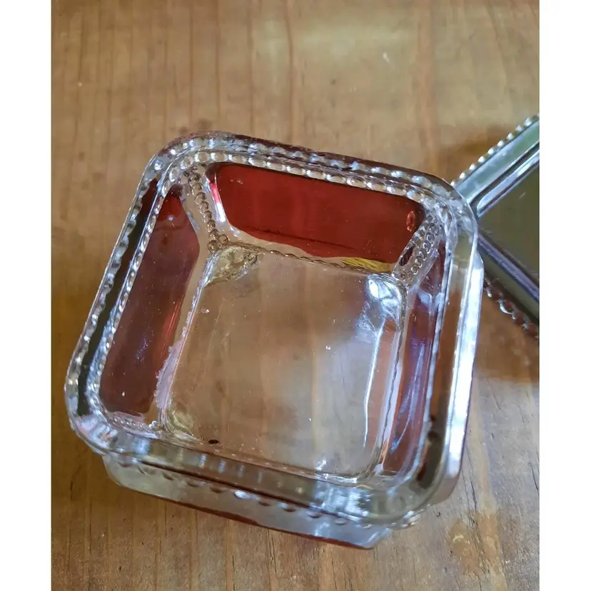 Add a touch of elegance to your space with this vintage ruby red glass trinket box. Perfect for storing small treasures or as a decorative piece on your vanity. Please see all pictures for condition and measurements.