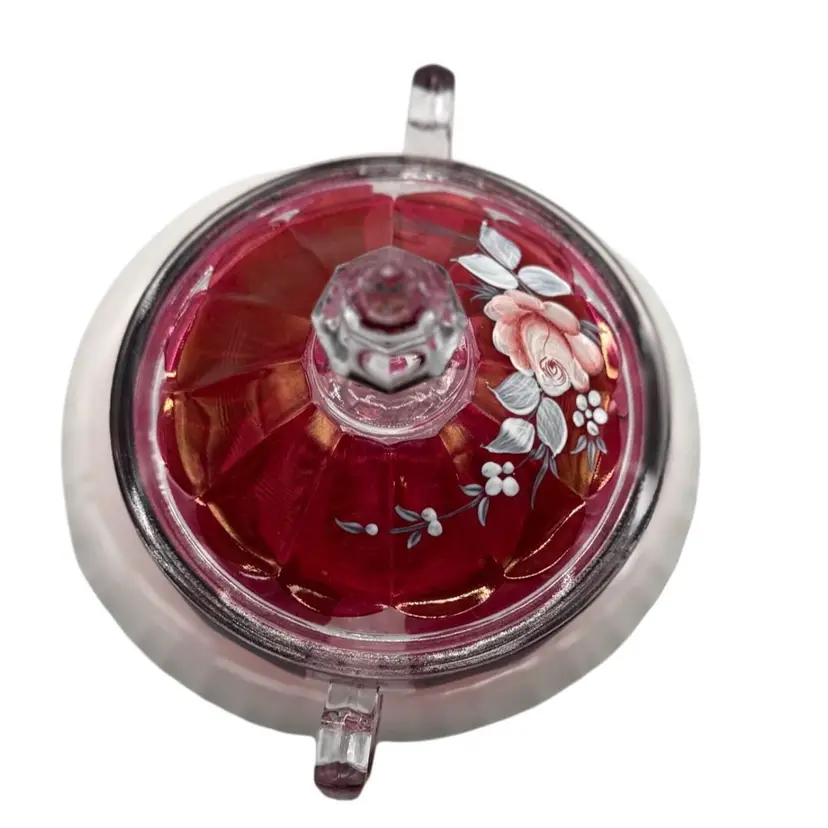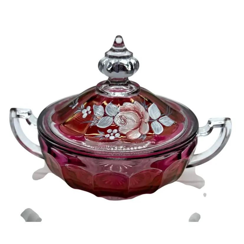 Vintage Westmorland Hand-Painted Ruby Glass Candy Dish Lid Floral Signed 1977