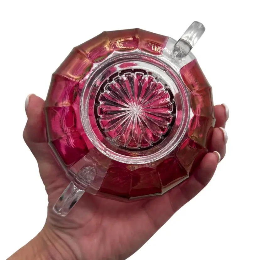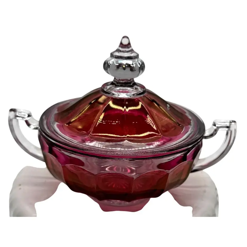 This vintage ruby red glass candy dish with a hand-painted floral design and clear handles offers both style and functionality. Its intricate craftsmanship and signed detail add a touch of elegance to any collection or display.