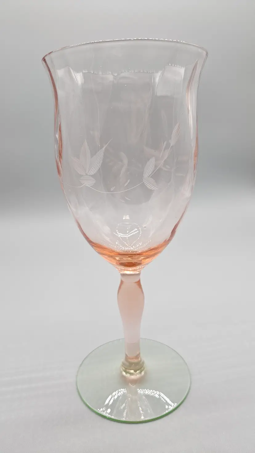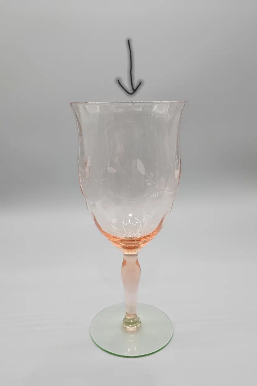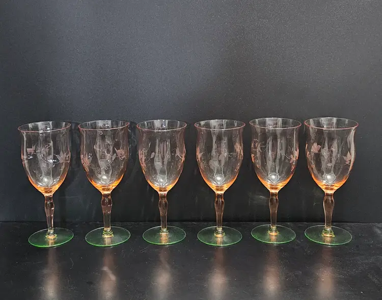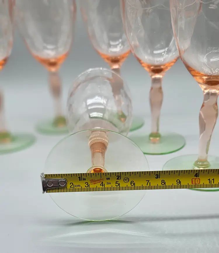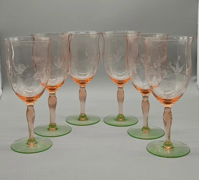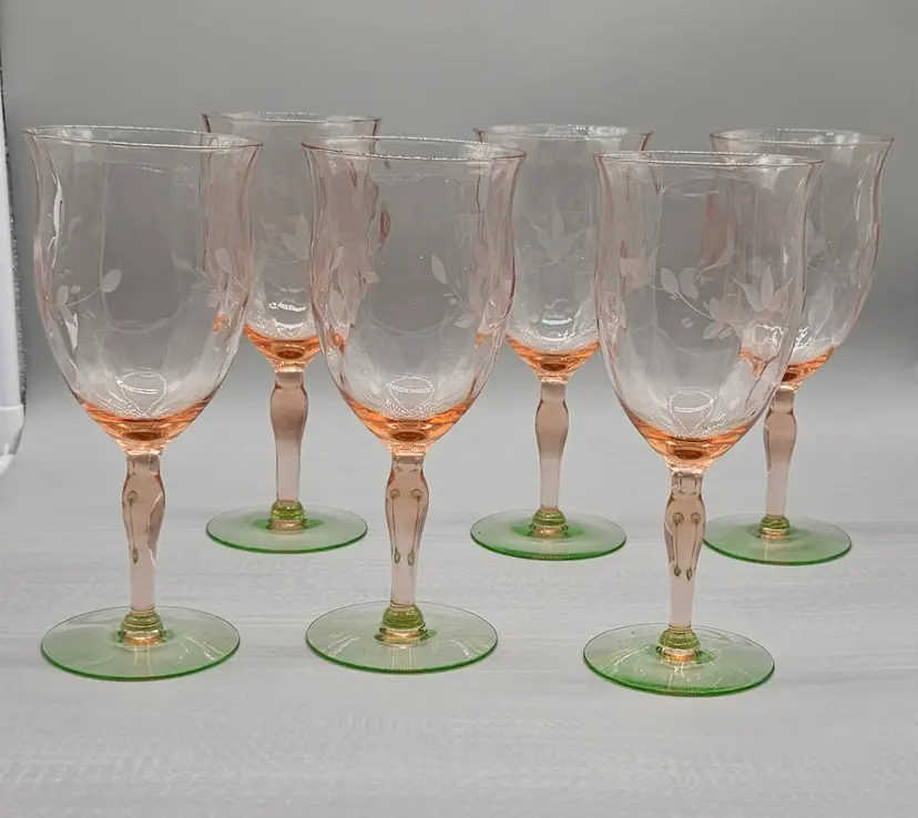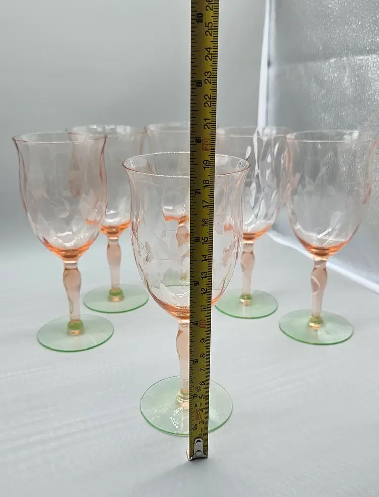 A set of 6, Vintage Weston pink and green watermelon Stemmed glasses/goblets. The pink top portion of these glasses have and etched floral design and their bases are green uranium glass, that glows under a black light. These elegant glasses are delicate and somewhat light weight. They are approximately 7 1/4" tall. Their bases are approximately 2 3/4" wide and 3" wide at their opening. There is one glass that has a tiny knick on the rim (shown in photos). It does not appear to compromise the glass. They are in Good, Pre-owned condition, showing minimal to no wear from age and previous use. There are no breaks, no cracks. See all photos of description