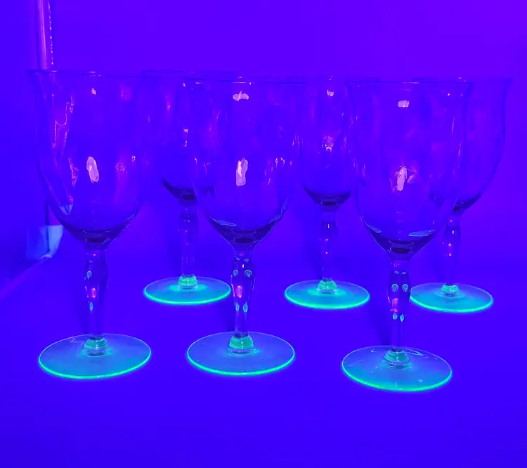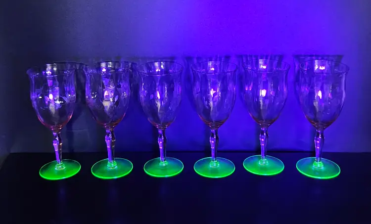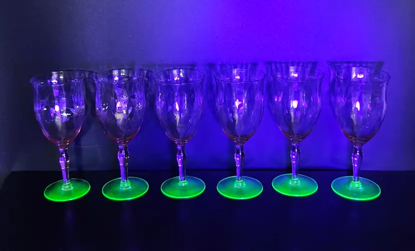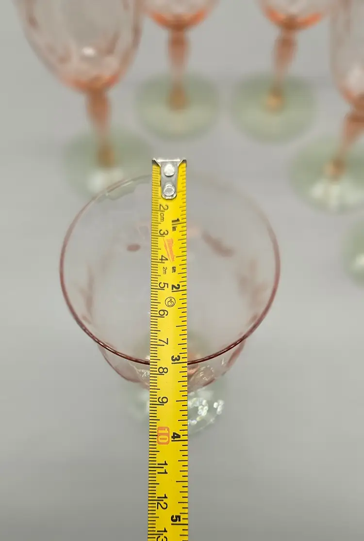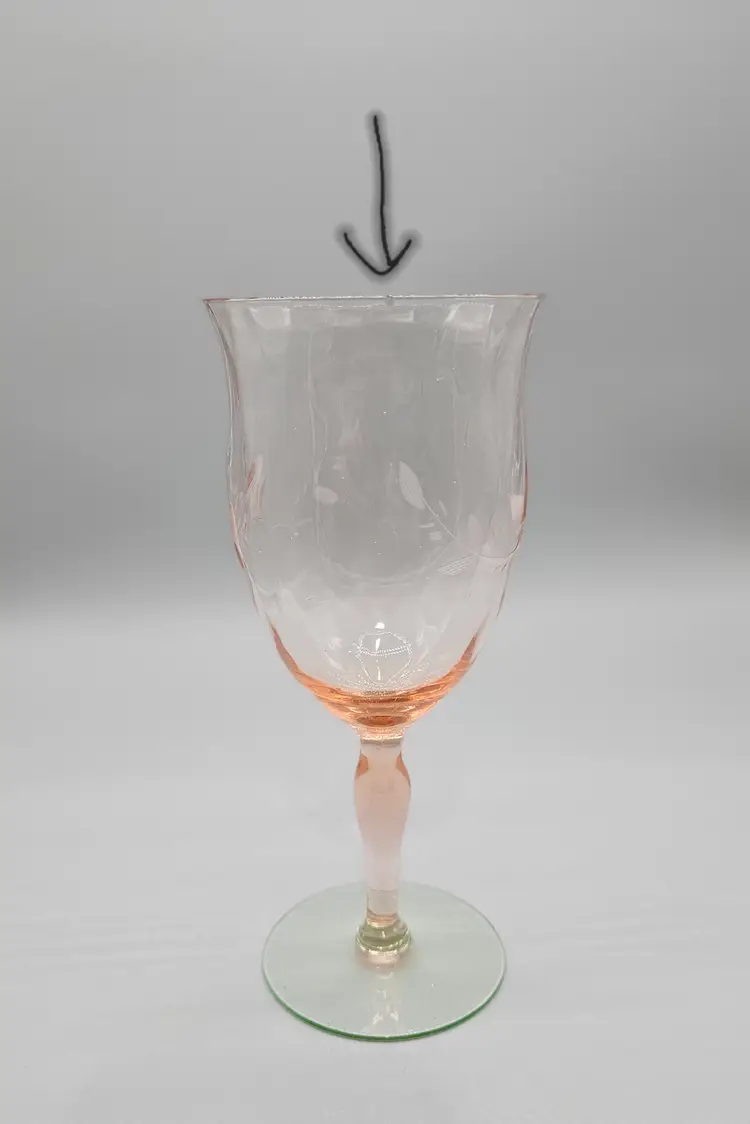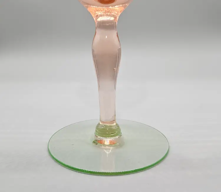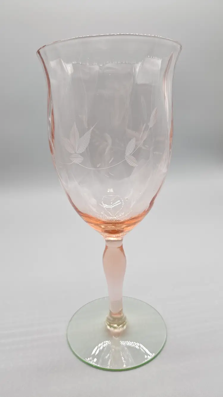 A set of 6, Vintage Weston pink and green watermelon Stemmed glasses/goblets. The pink top portion of these glasses have and etched floral design and their bases are green uranium glass, that glows under a black light. These elegant glasses are delicate and somewhat light weight. They are approximately 7 1/4" tall. Their bases are approximately 2 3/4" wide and 3" wide at their opening. There is one glass that has a tiny knick on the rim (shown in photos). It does not appear to compromise the glass. They are in Good, Pre-owned condition, showing minimal to no wear from age and previous use. There are no breaks, no cracks. See all photos of description