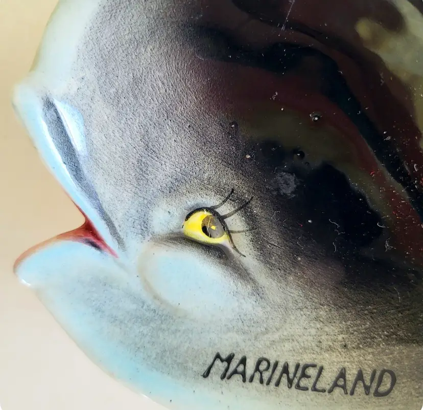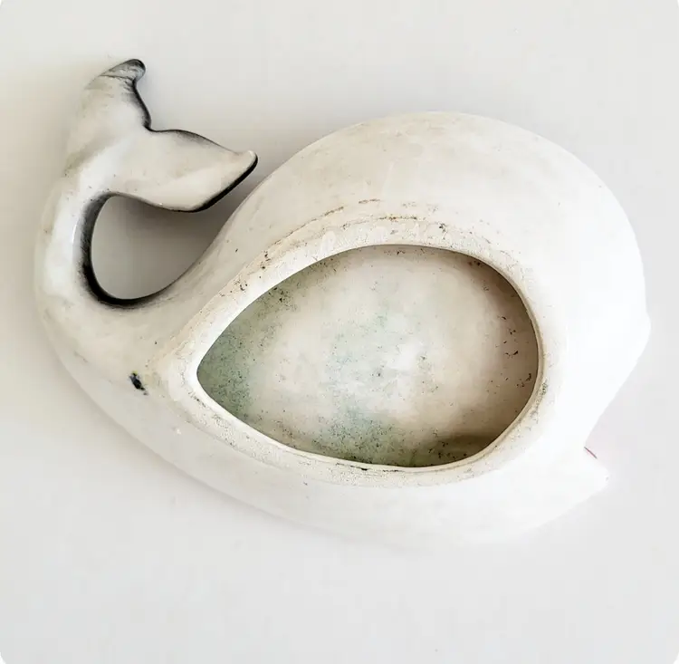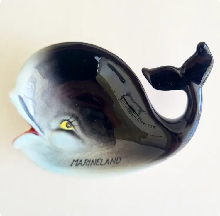 Vintage whale Marineland trinket dish. Some crazing present. See all photos- back of dish does have some staining present. No chips. Measures 5.25 in x 3.5 in