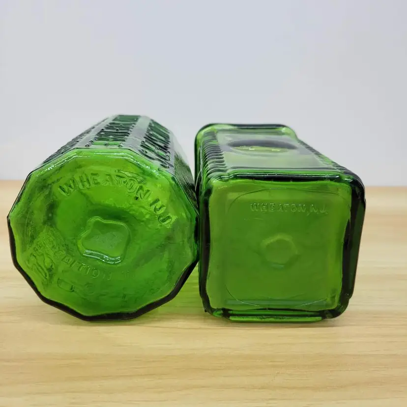 Set of 2 Vintage Green Glass Wheaton Apothecary Bottles. Perfect for adding a spooky touch to your Halloween decor or for displaying year-round. Both bottles are in excellent vintage condition with no chips or cracks.