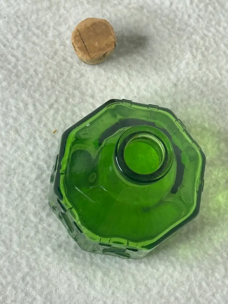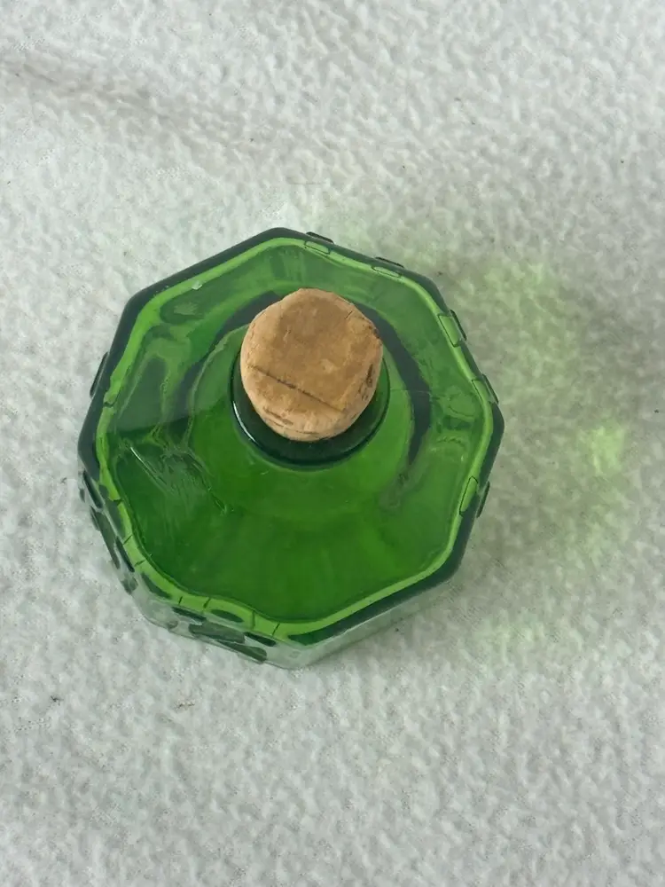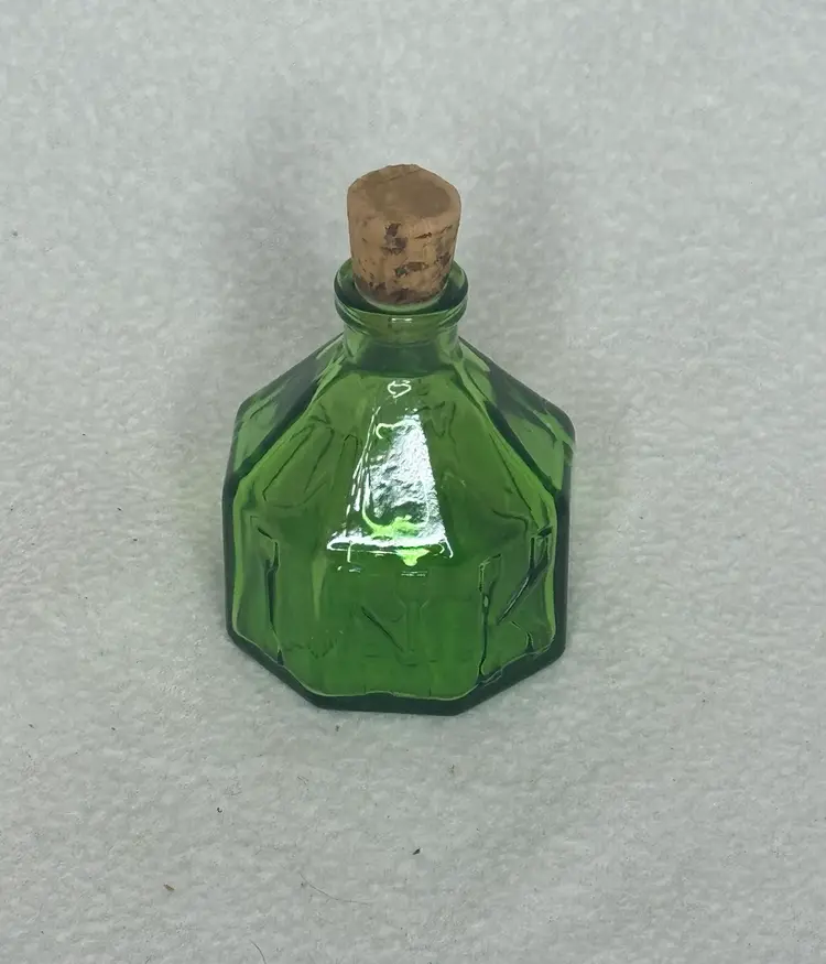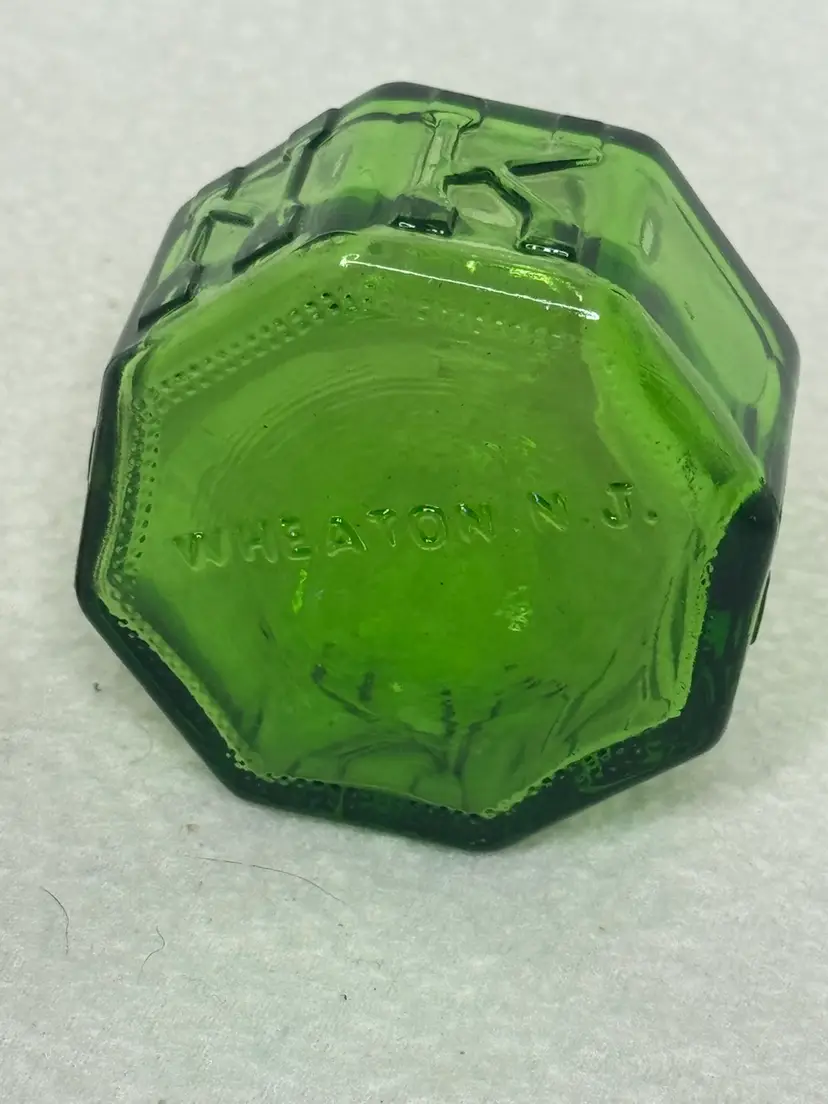 This vintage green glass ink bottle was manufactured by Wheaton Glass, Millville, New Jersey. It is Octagonal in shape with "INK" embossed on the sides; 3.5” H x 2.5” W