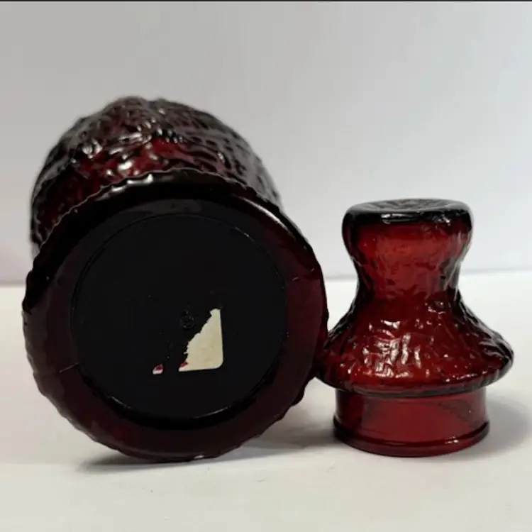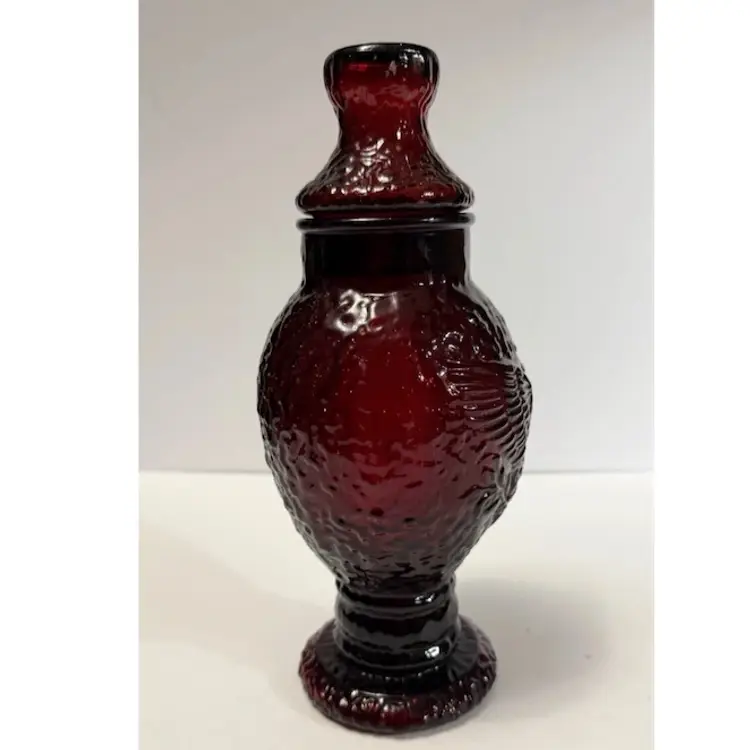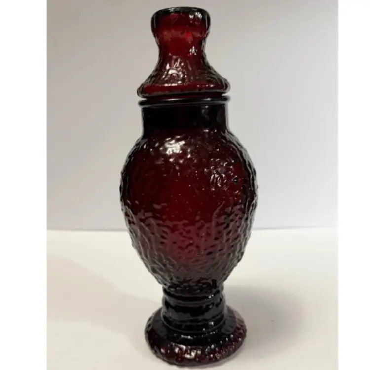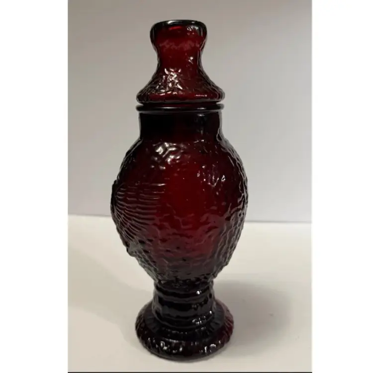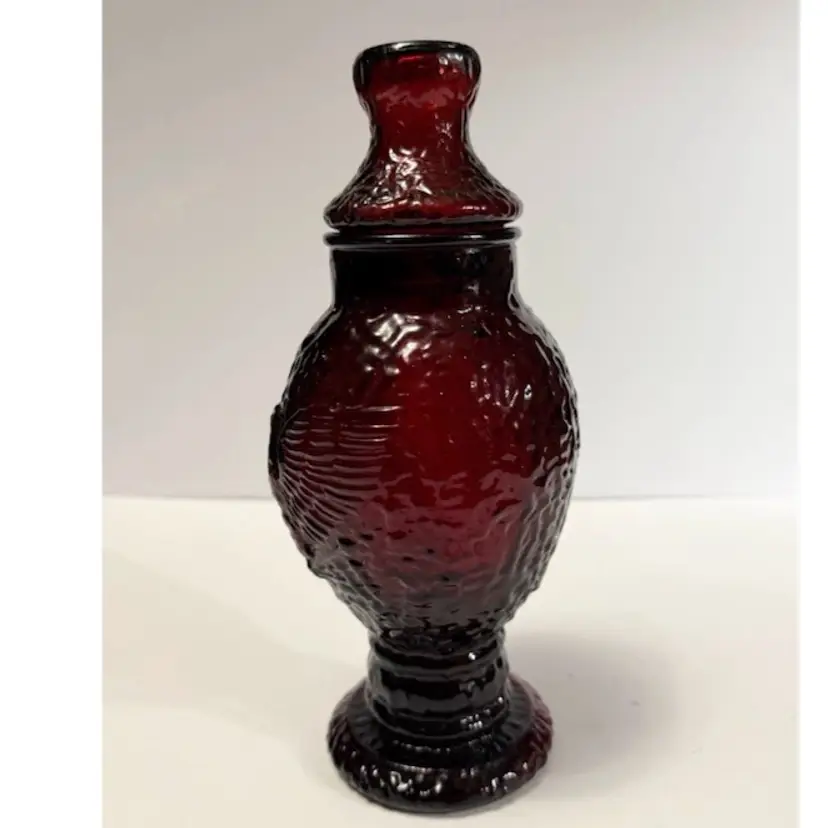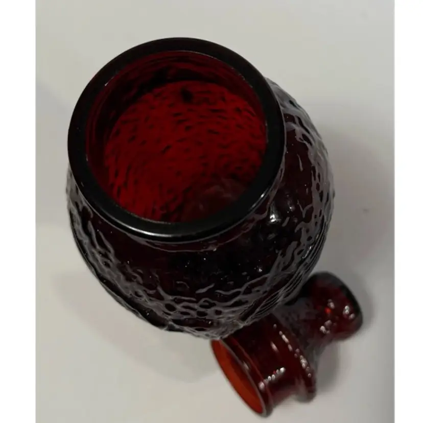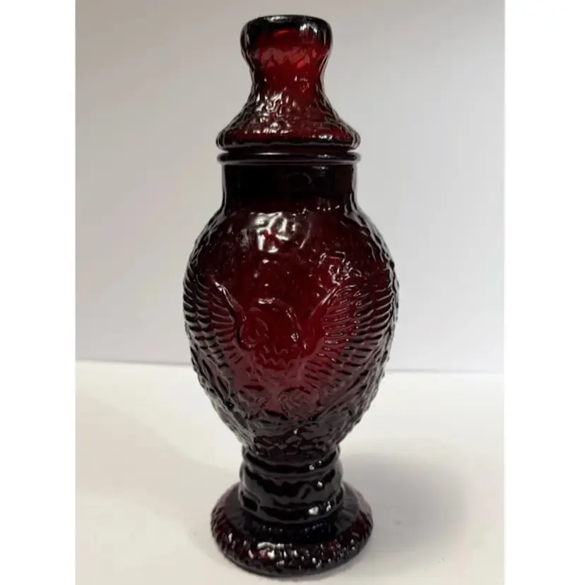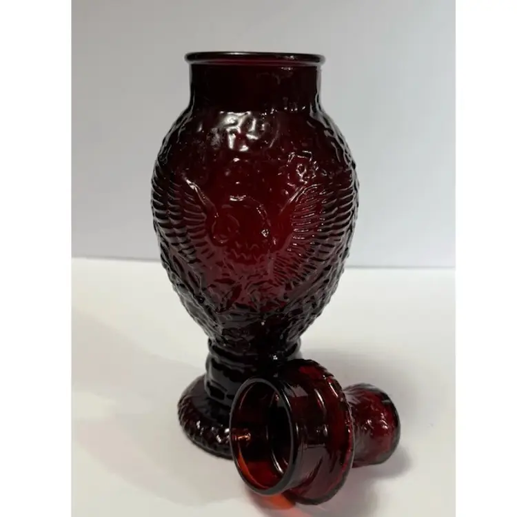 This vintage Wheaton glass vase is a stunning piece that will surely add a touch of elegance to any space. The vase features a beautiful ruby red color and is made of high-quality glass material. The intricate embossed design on the vase showcases a majestic eagle, making it a perfect addition to any patriotic-themed collection.