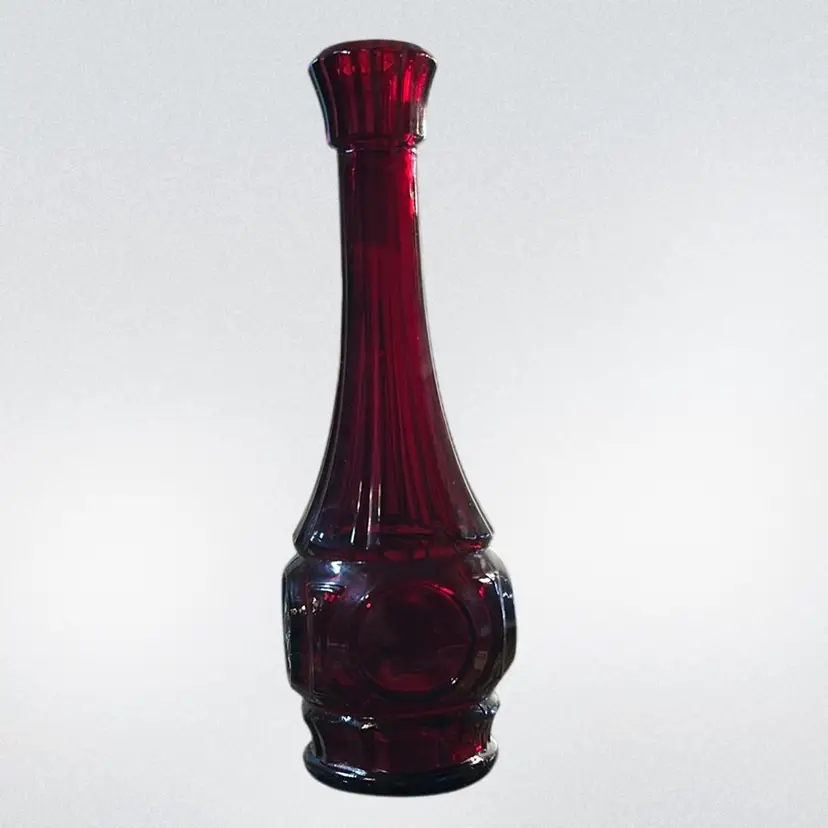 This item is a vintage Wheaton Ruby red bud vase known for its elegant and classic design the vase features a deep ruby red color and a narrow neck, making it perfect for a single stem flower or as a decorative piece. It embodies mid-century style and a simple yet striking appearance. It stands 9 inches tall 3 inches wide. There are no chips or cracks.