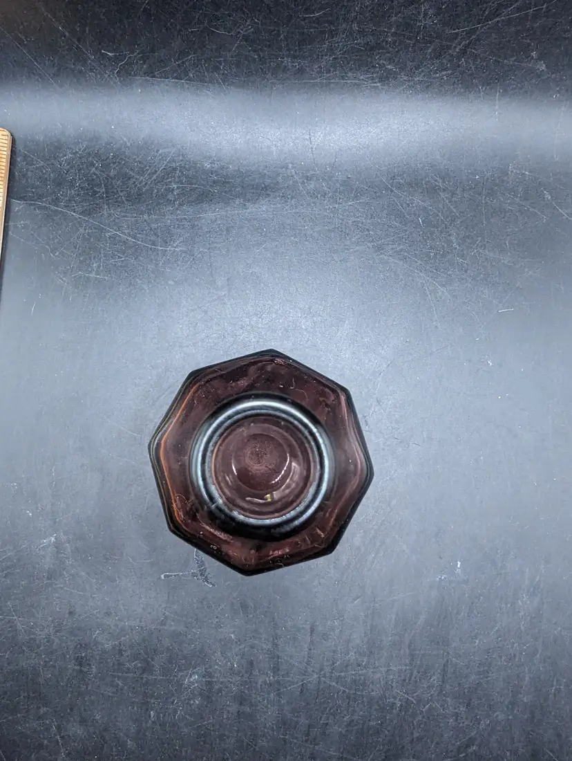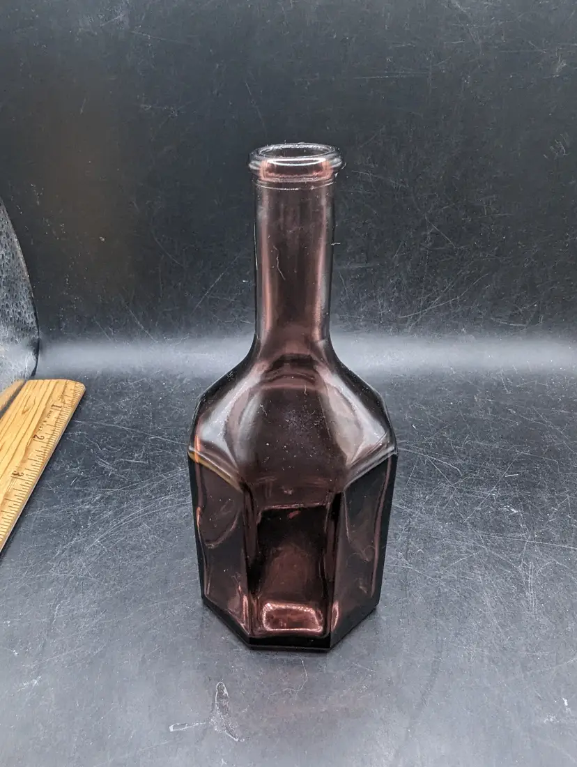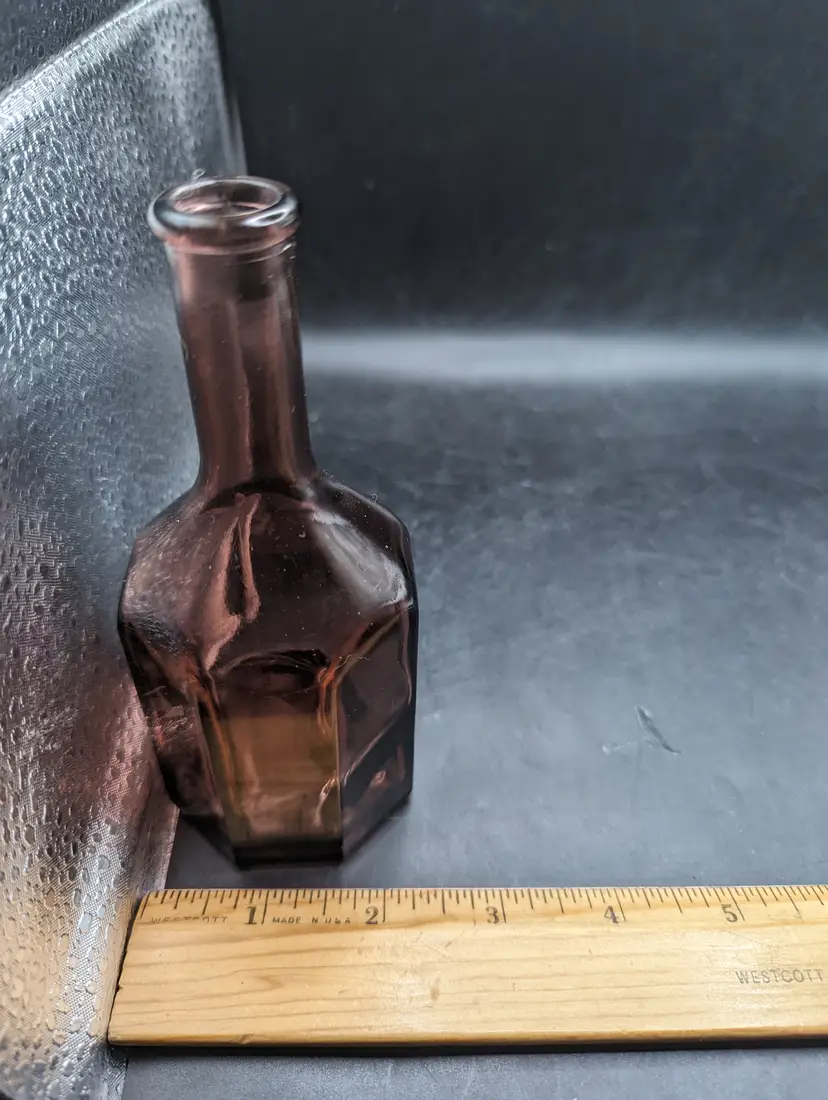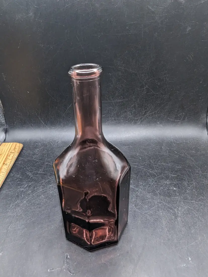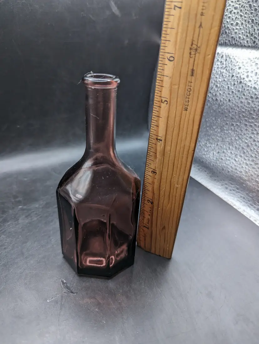 This is a lovely Vintage Wheaton Style Amethyst Glass Small 5.5 inch Bottle 8 Sided Long Neck Miniature. No chips or cracks. Please see all pictures for condition and measurements.