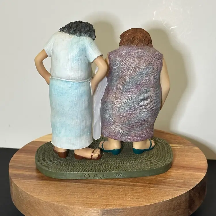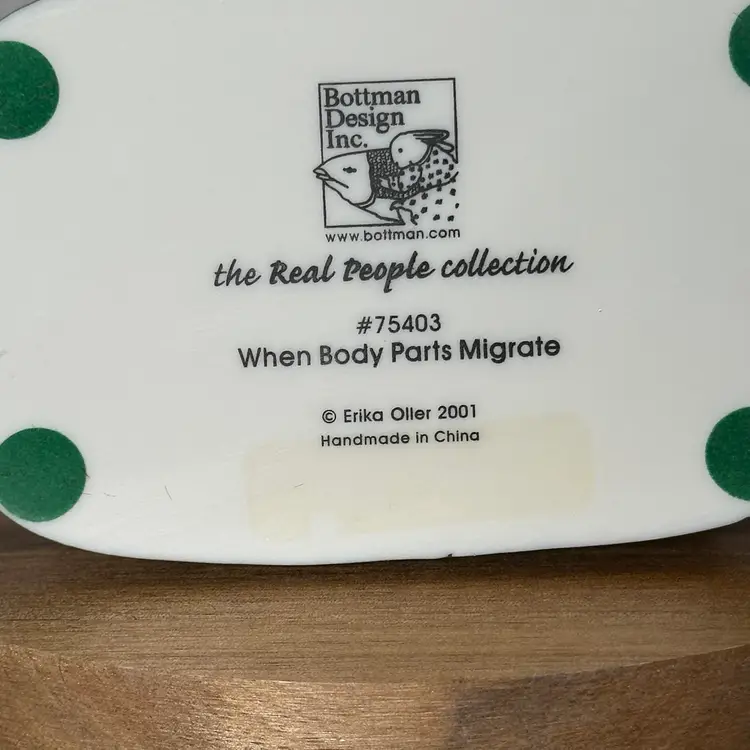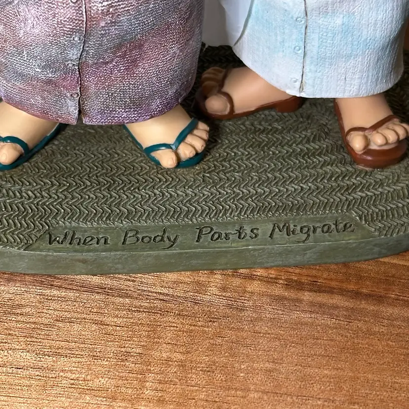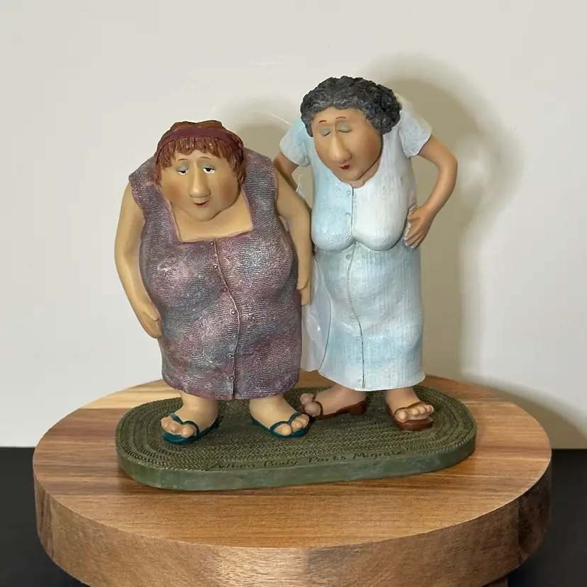 This is a collectible figurine titled "When Body Parts Migrate" from "The Real People" collection designed by Erika Oller for Bottman Design. Humorous depiction of aging