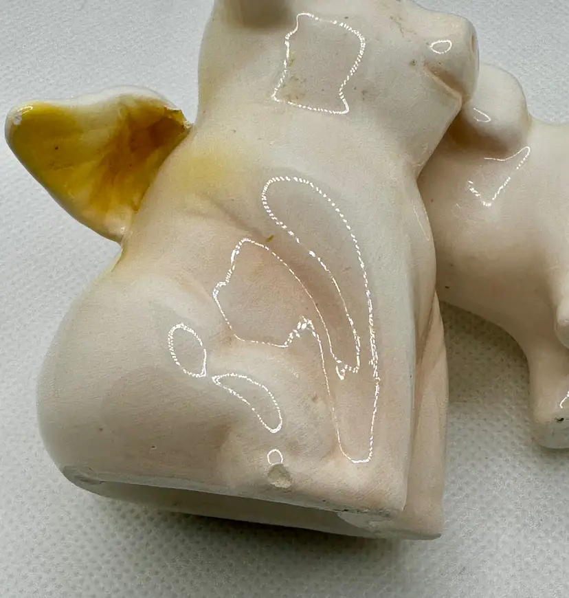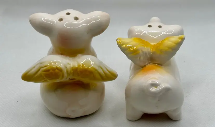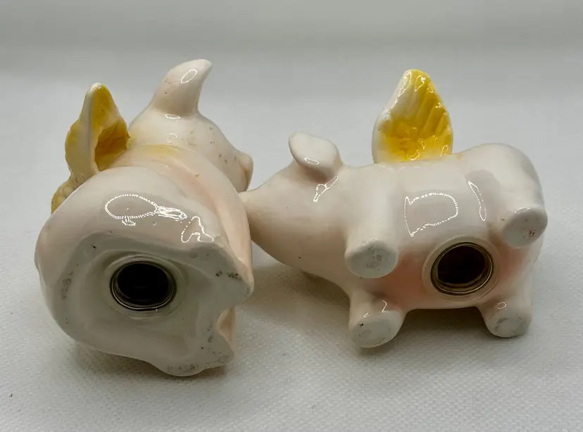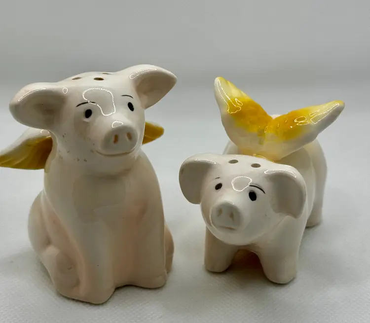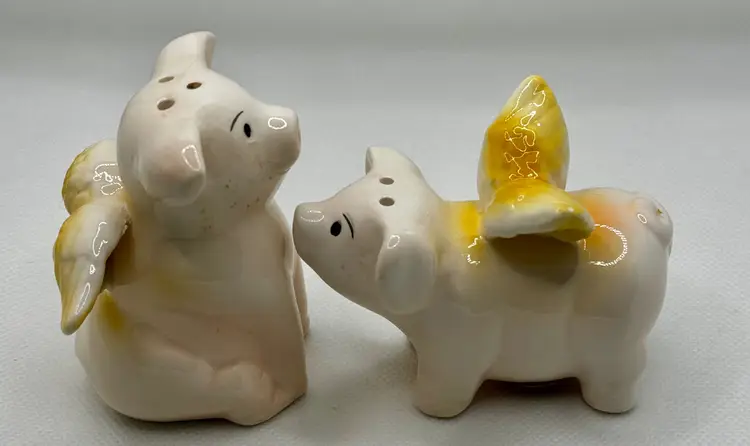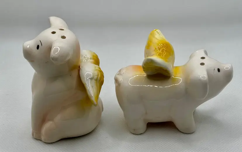 Add a touch of whimsy to your kitchen with these vintage flying pig salt and pepper shakers. Each shaker features a charming pig with wings, perfect for adding a playful element to your dining table. Made of ceramic, these shakers are both functional and decorative. They show minor signs of age, adding to their vintage charm. Has one small chip (see pics), no cracks. Sitting pig measures 2x3x2 inches, standing pig measures 3x2.5x1.75 inches. Weighs 8oz.