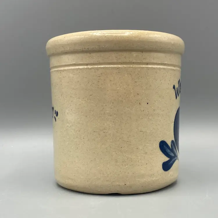 This crock has a marking that looks like it is Rockdale Union Stoneware Pottery, but the marking on it is unreadable, so I am not sure. This measures approximately 3 5/8" tall x 3 1/2" across.