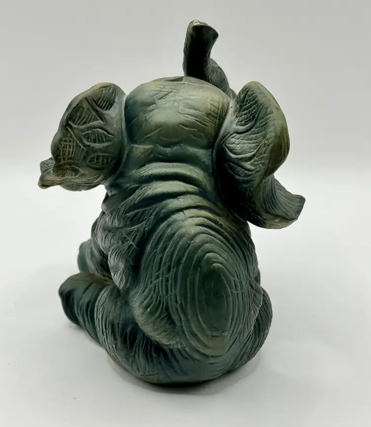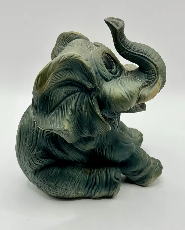 Add a touch of whimsy to your decor with this charming vintage ceramic elephant figurine. Featuring a textured green finish that mimics the reptile's unique skin, it's a delightful piece for any collector or as a quirky accent in your home. No visible damage. Measures 5x6.25x4. Weighs 2lb.