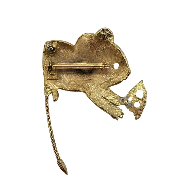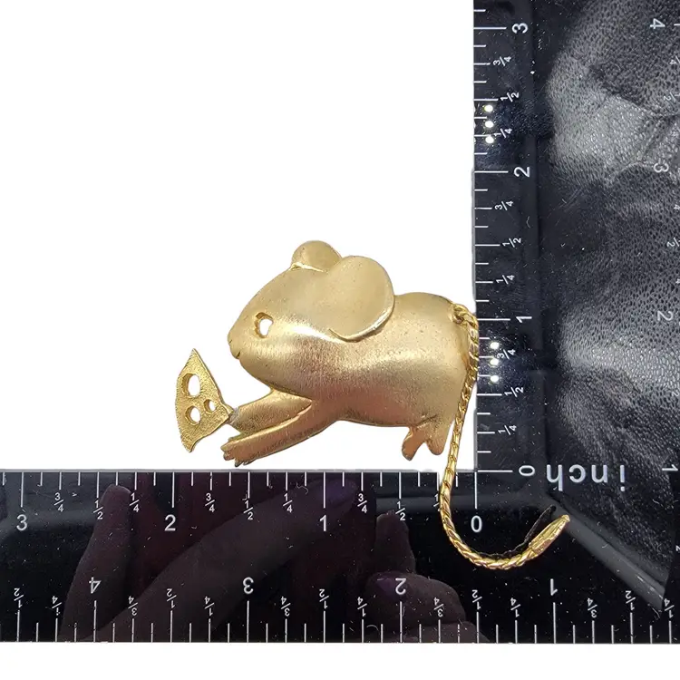 In a whimsical world where mice hold cheese and tails swing freely, this vintage brooch brings a playful charm to any ensemble. Crafted in a delightful gold tone, it captures the essence of curiosity and mischief. Perfect for adding a touch of character to your attire, this piece is a conversation starter and a delightful accessory.