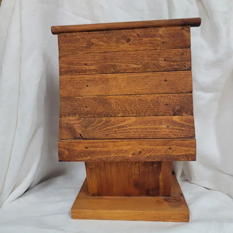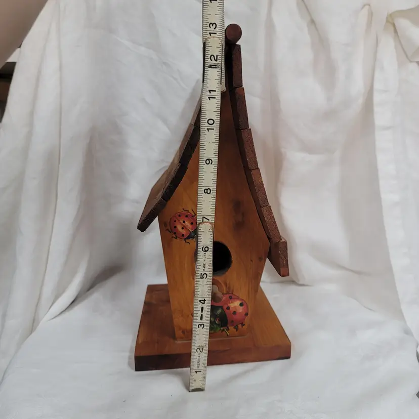 Vintage wooden birdhouse with whimsical shape and ladybug details. Free standing. Very good condition. It measures approximately 13.75" x 6.25" x 8"