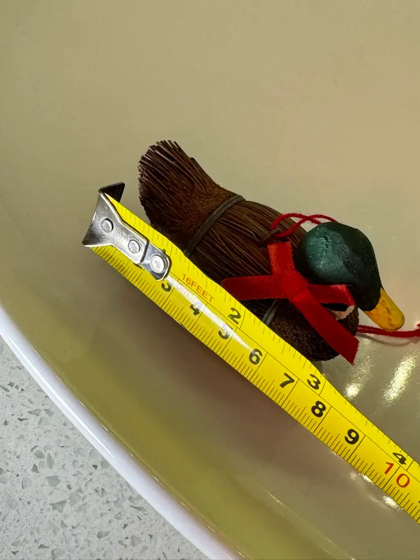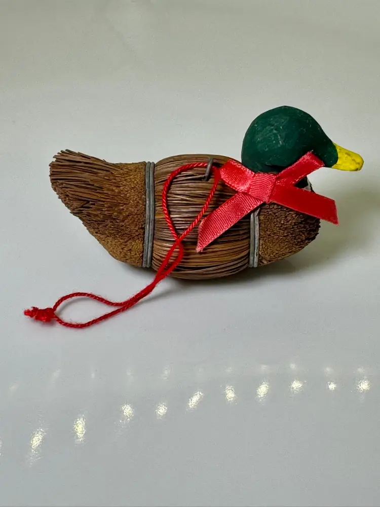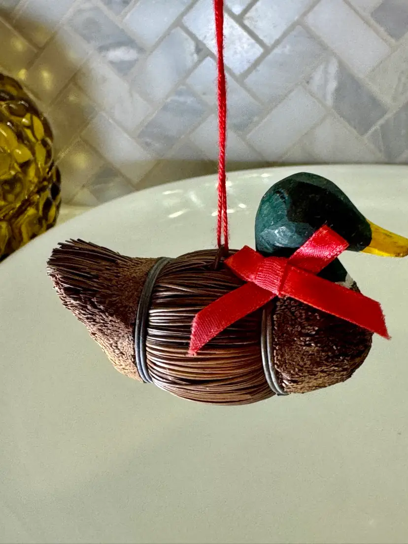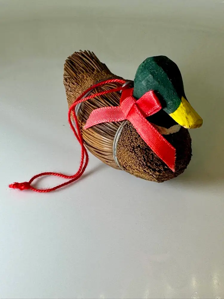 Vintage Mallard Duck Ornament made out of a whisk brush with a wooden head.