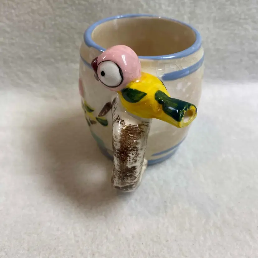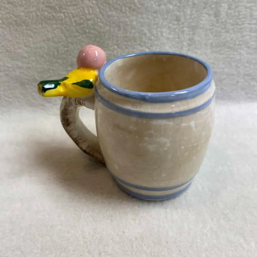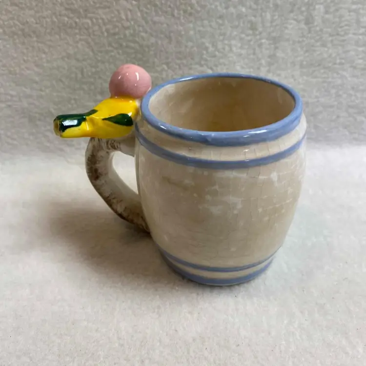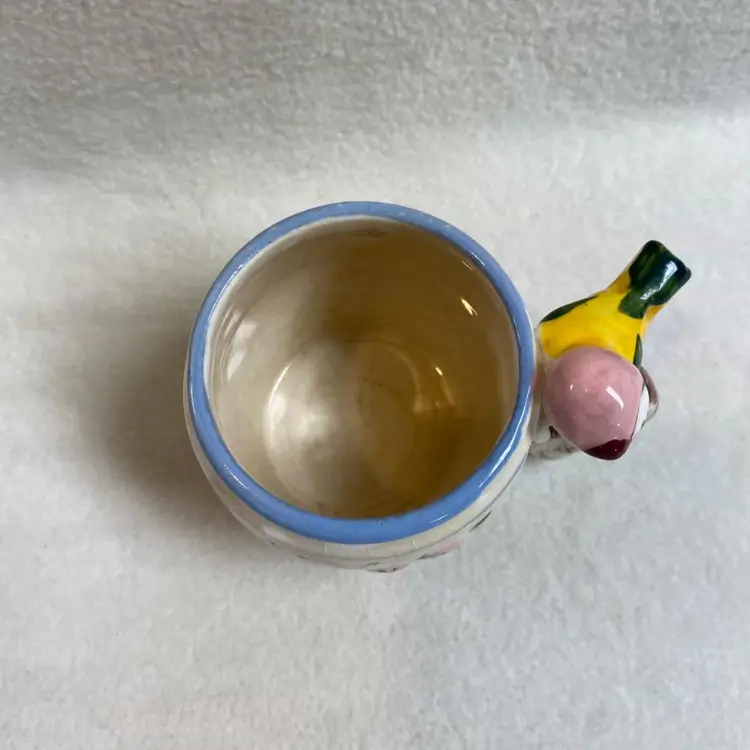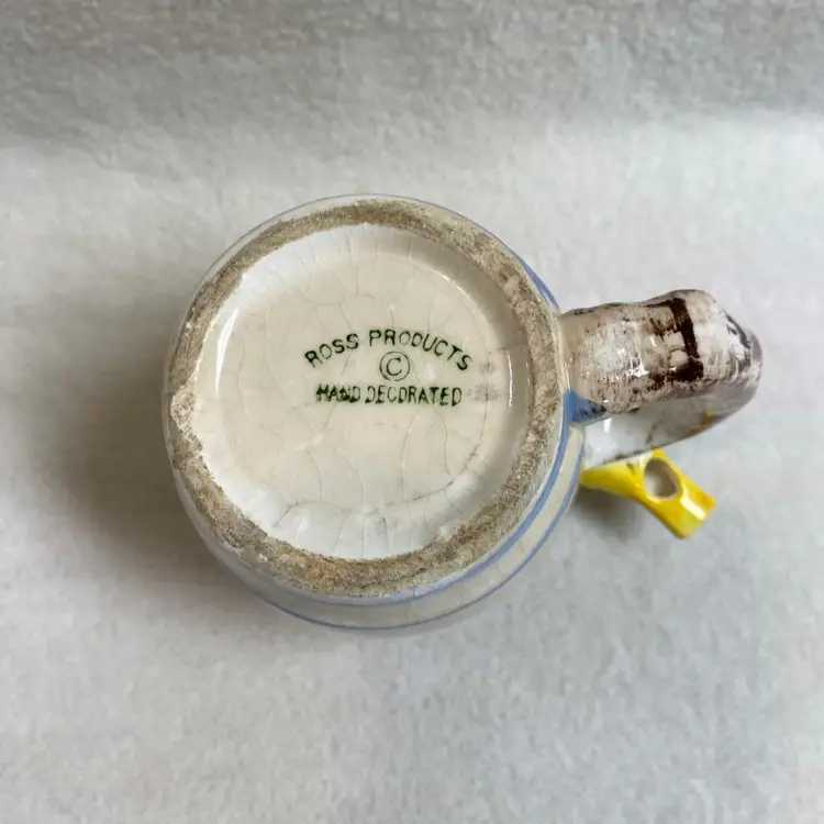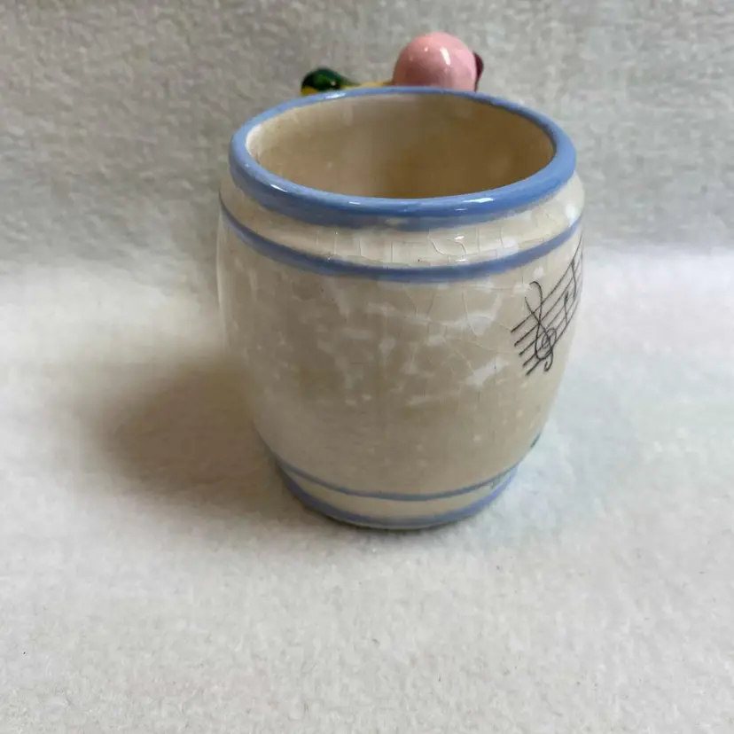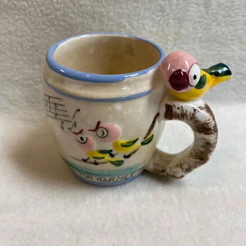 This is a vintage Ross Products ‘Whistle for Your Milk’ child’s mug. It features singing dimensional birds on the front as well as a bird on the handle. There is significant cracking under the glaze as well as discoloration under the glaze. Overall it is in good condition for its age (1950’s).