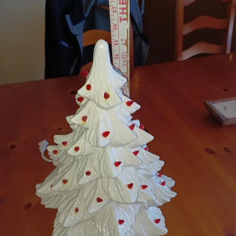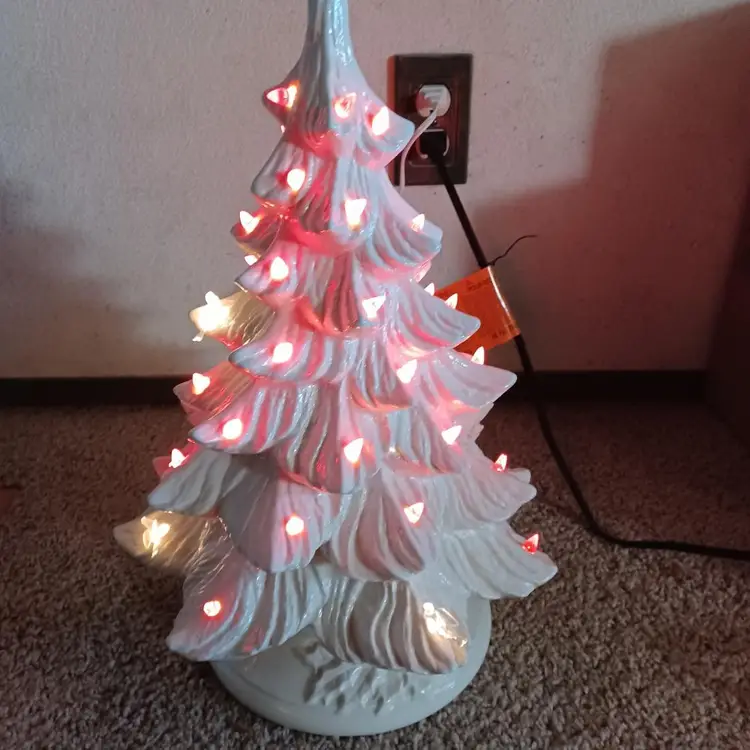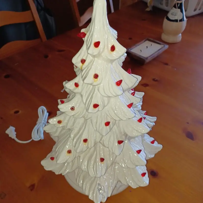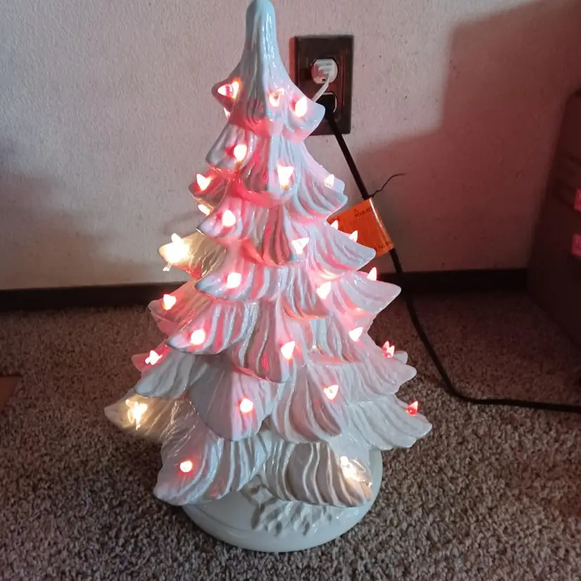 Vintage 15 inch white ceramic Christmas tree Mold. Tree mold by Nowell Light kit does work (Pictured) will not include a light bulb for safer shipping. Most of the light pegs are glued in the ones that are not will Be placed in a plastic bag for shipping. Please see all pictures as they're the best description all items from a smoke-free home with pets experienced Christmas mold shipper