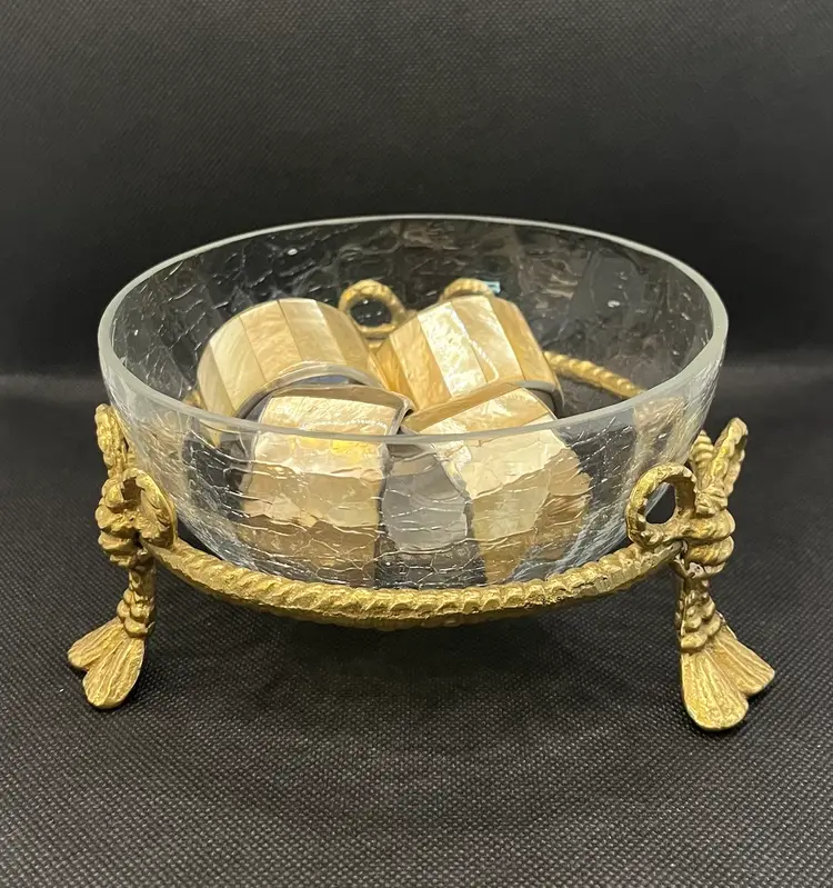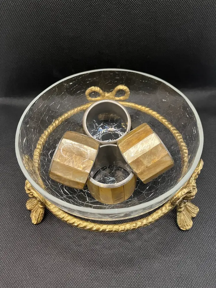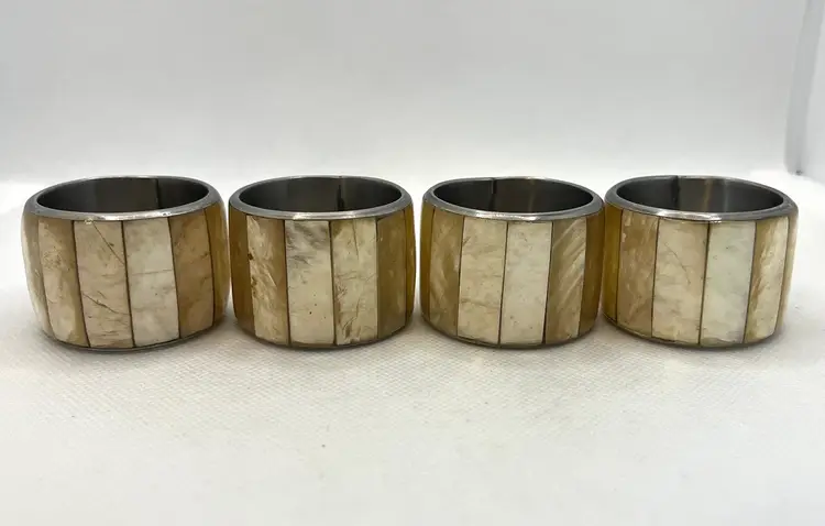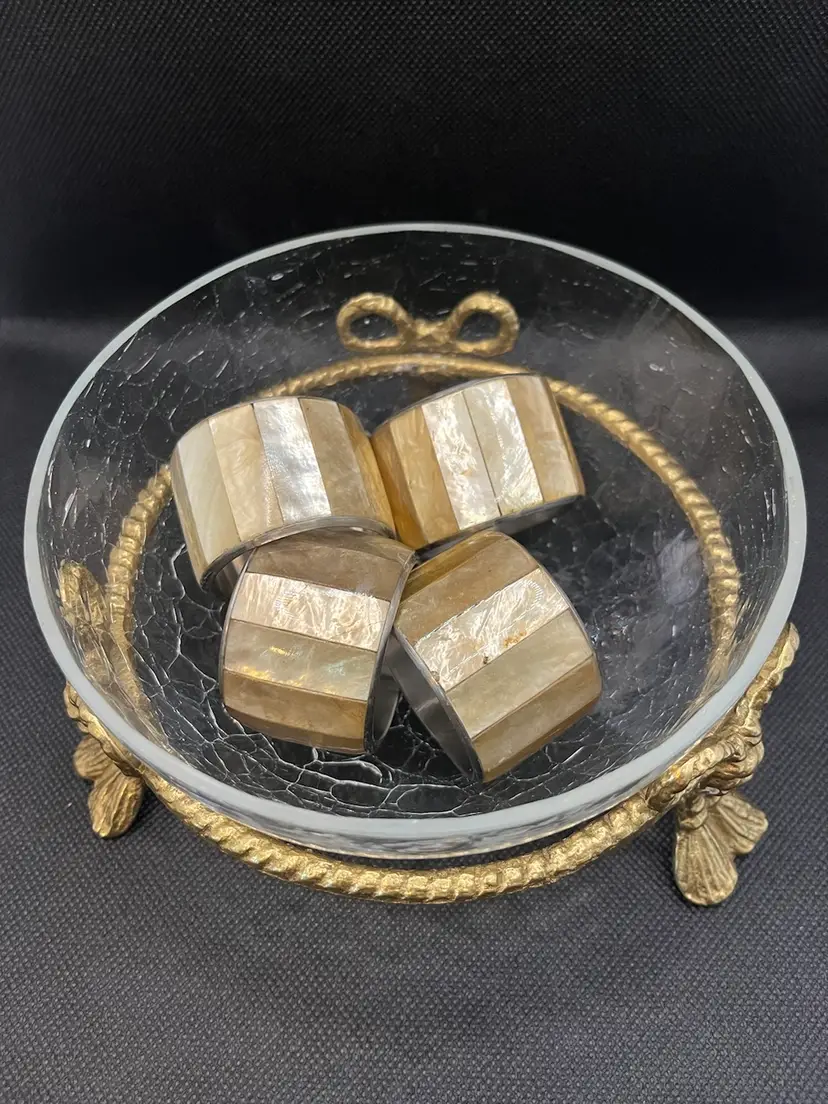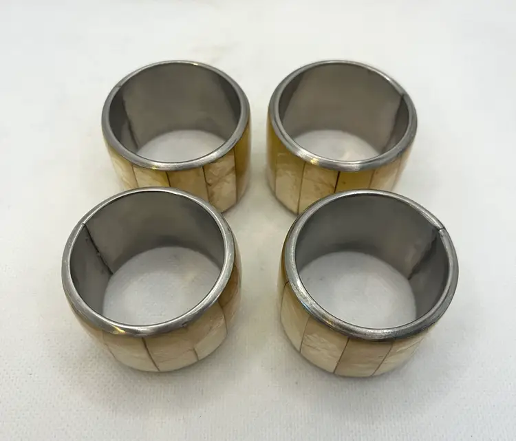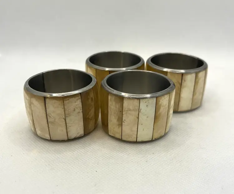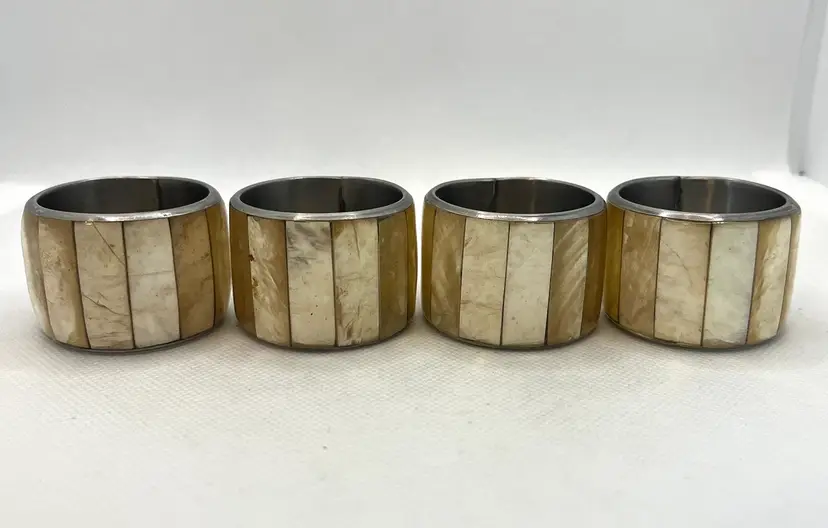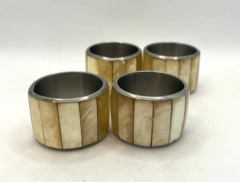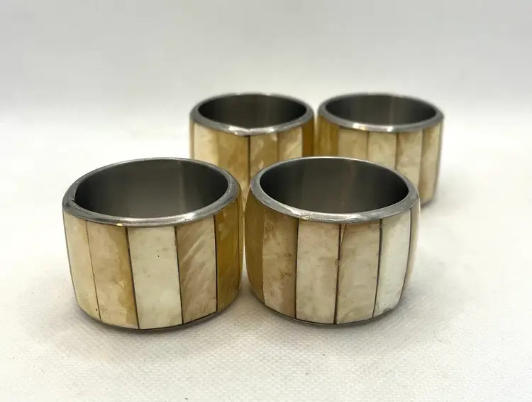 Vtg White Iridescent Inlay Capiz Shell MCM Metal Napkin Beach Tiki Rings Set 4. Vintage wear and patina with no major damage.