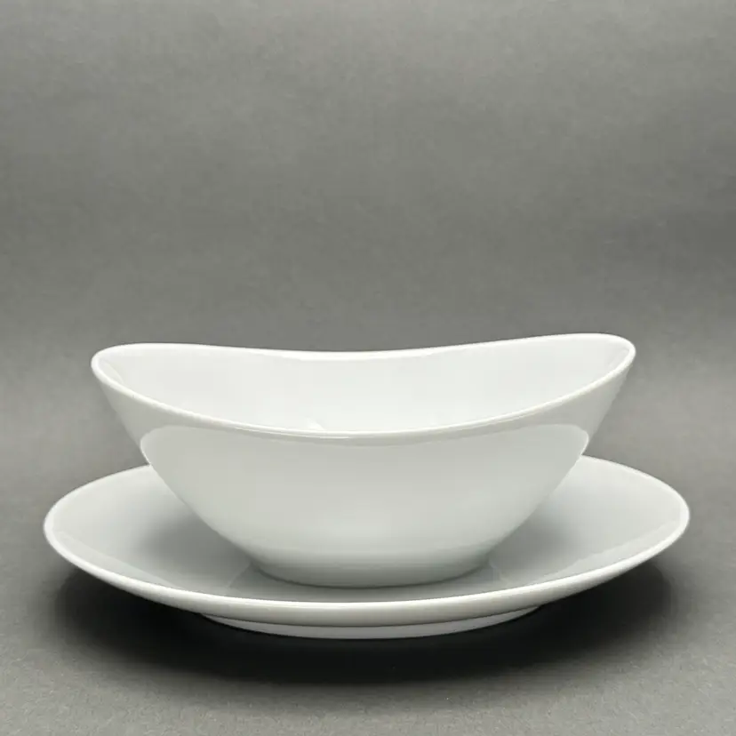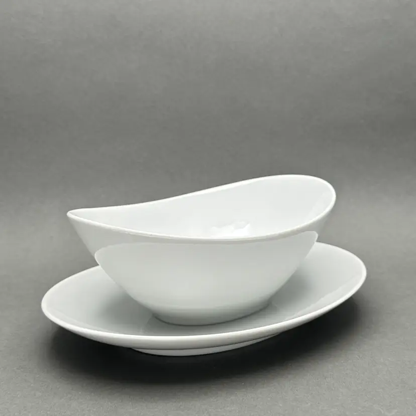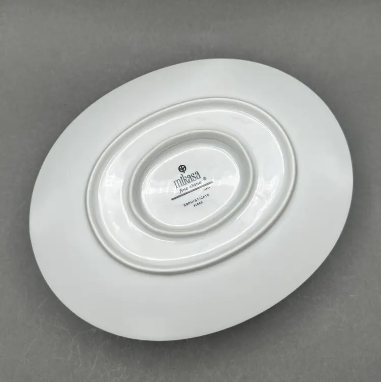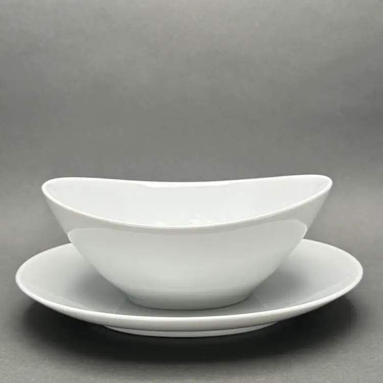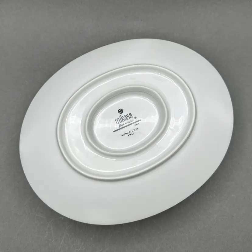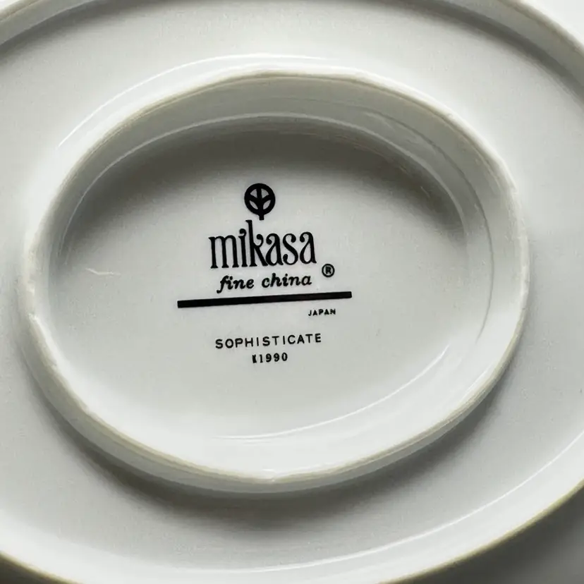 Description Vintage Condition: Excellent vintage condition. No visible chips, cracks, or scratches. Clean and glossy finish. Brand & Pattern: Mikasa Fine China, "Sophisticate" pattern (Model L1990). Made in Japan. Design: Iconic Mid-Century Modern / Space Age design featuring a sleek, biomorphic scoop shape with an attached "fast stand" underplate. Color: Bright, crisp white with no trim, making it a versatile match for any minimalist or modernist table setting. Material: Fine China (Porcelain).
