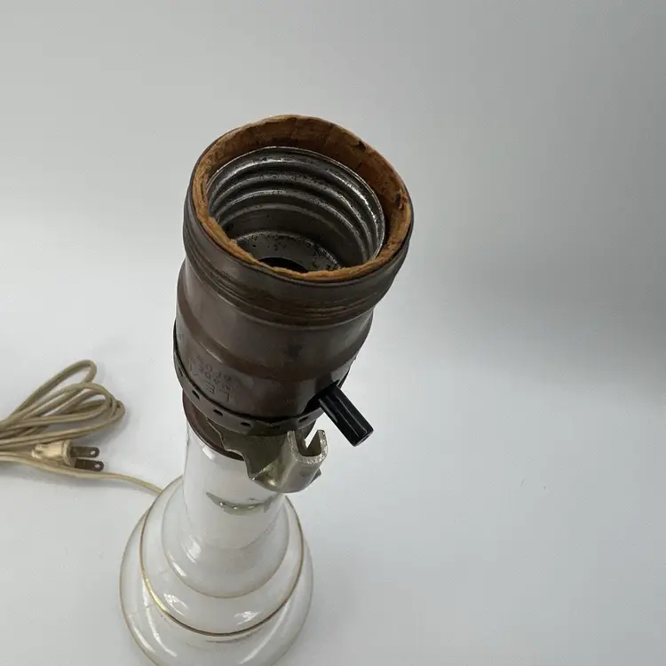 Measures 12" to top of bulb socket. No damage or major wear. Clean! Glass with gold and decal accents. Clean! No bulb, harp, or shade.
