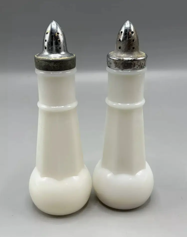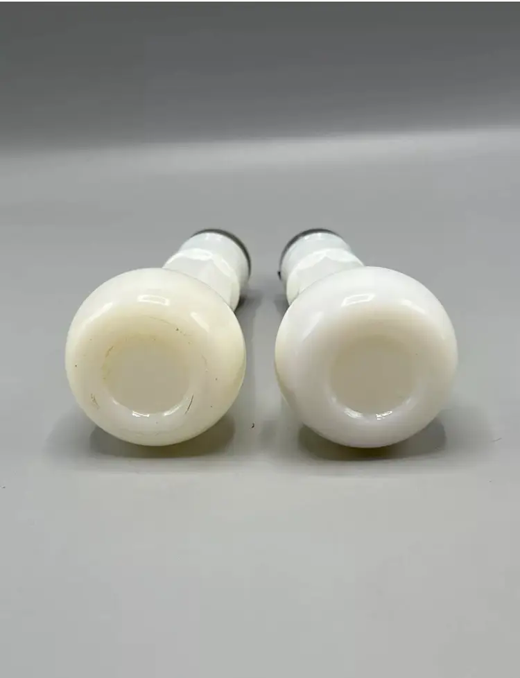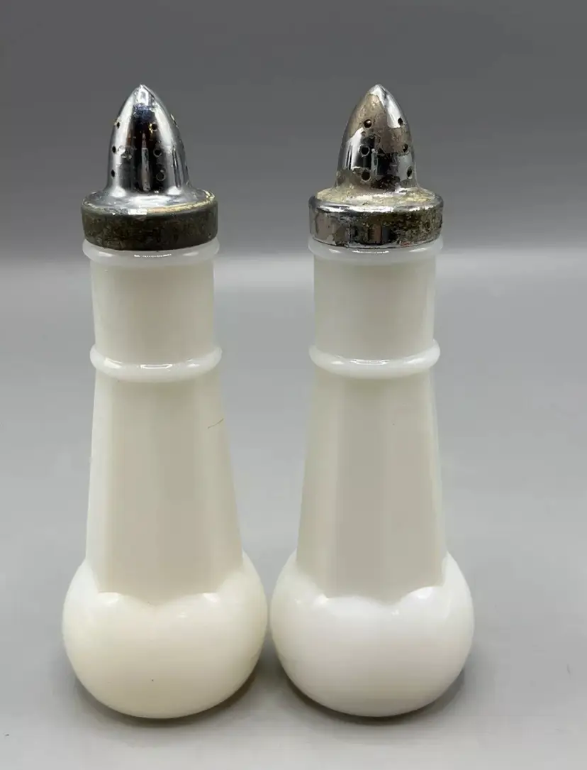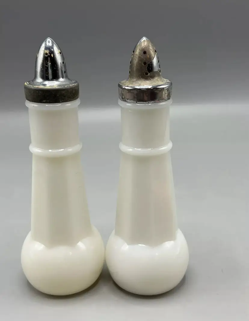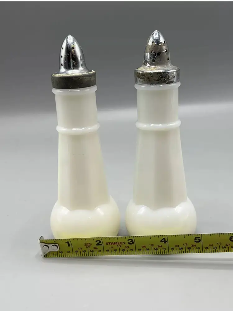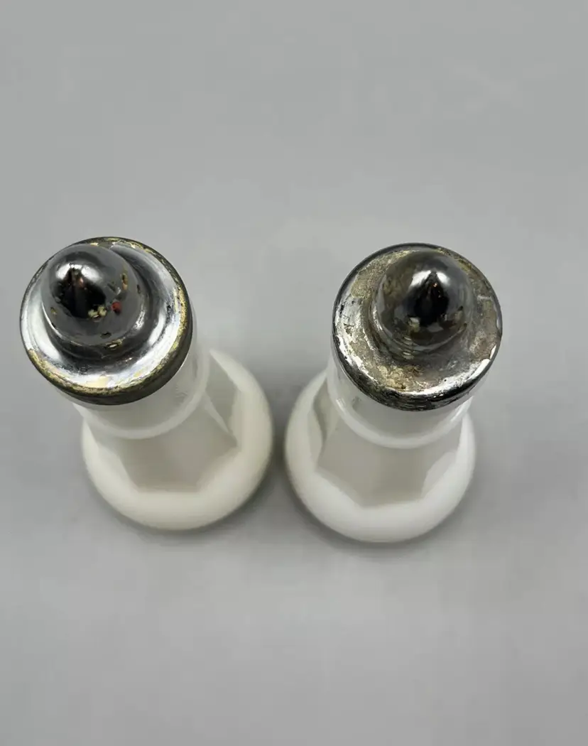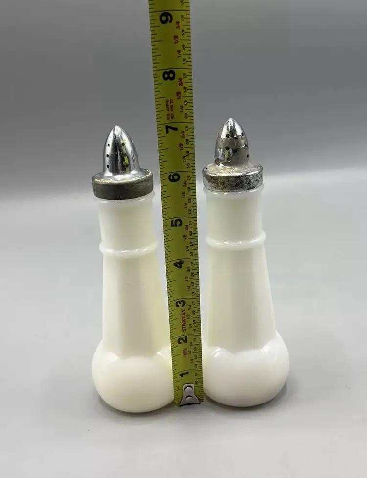 The shakers themselves are in very good condition, no chips or cracks to the milk glass. The silver screw tops to the shakers coating are showing signs of wear. Please look closely at the pictures to asses the condition. Please look at photos to see exact measurements