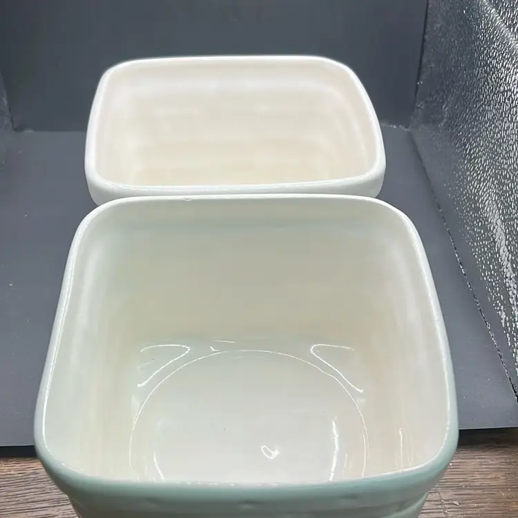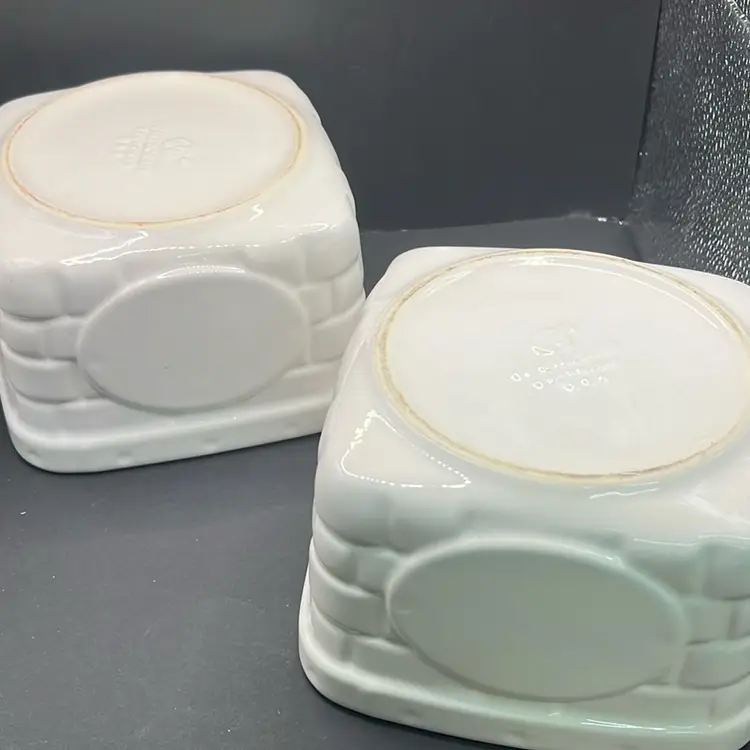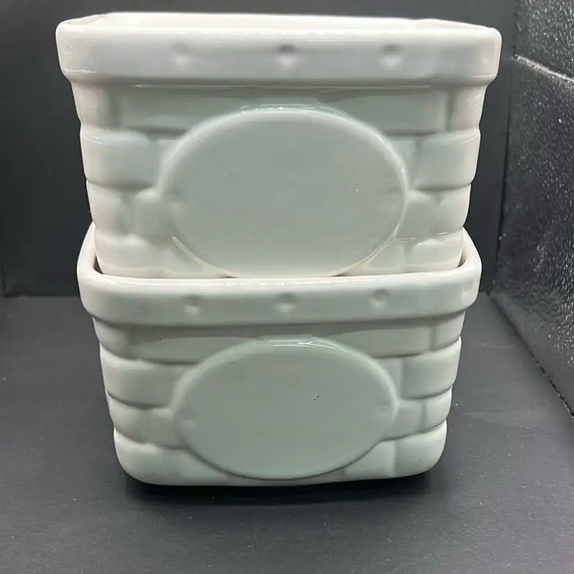 The 'Heirloom' line, particularly in white, evokes a sense of traditional craftsmanship and rustic charm. The basket weave design is a signature element, adding texture and visual interest. These bowls were popular as decorative centerpieces and functional serving dishes. Set of two… vintage condition, see pictures for details no chips or cracks , sale does not include staging items… only two ceramic baskets