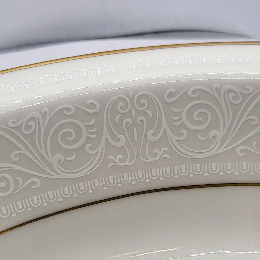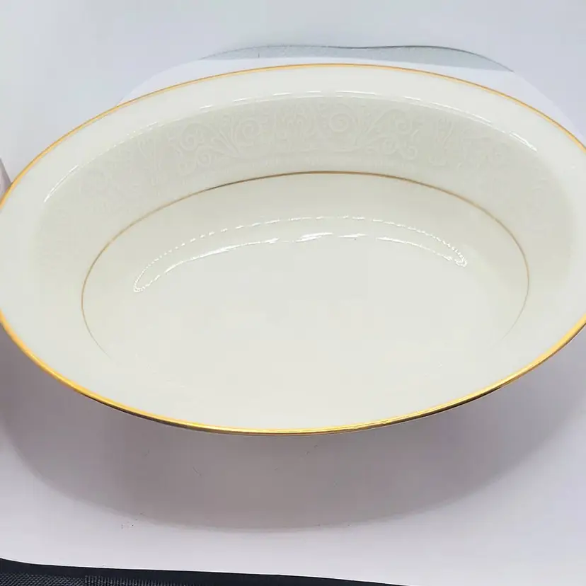 Elegant vintage serving bowl featuring a delicate gold trim and intricate embossed design. Perfect for adding a touch of sophistication to your dining table!