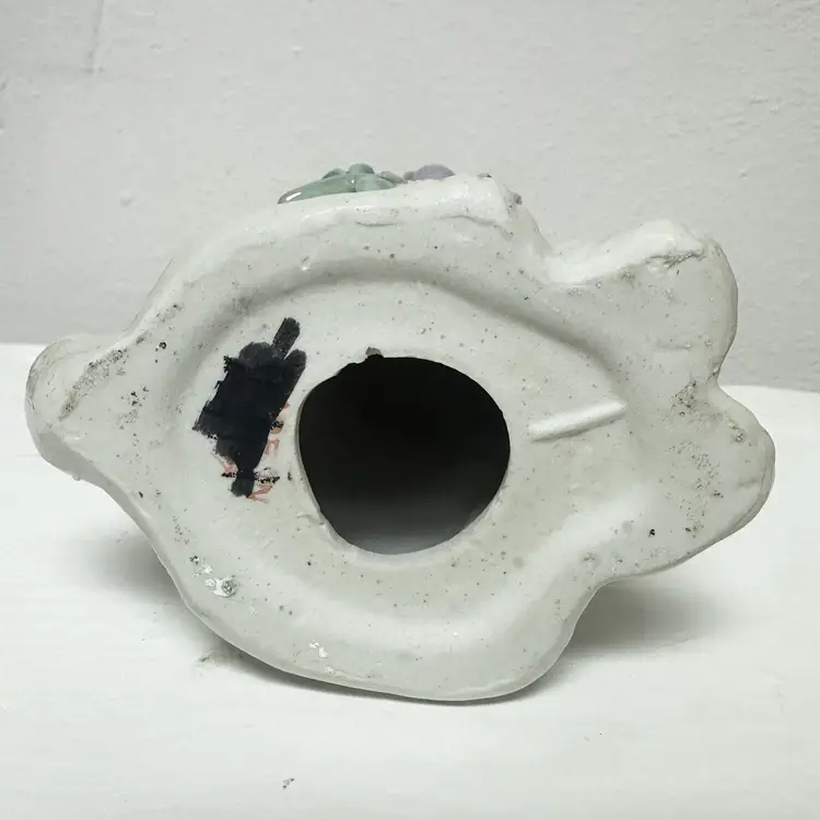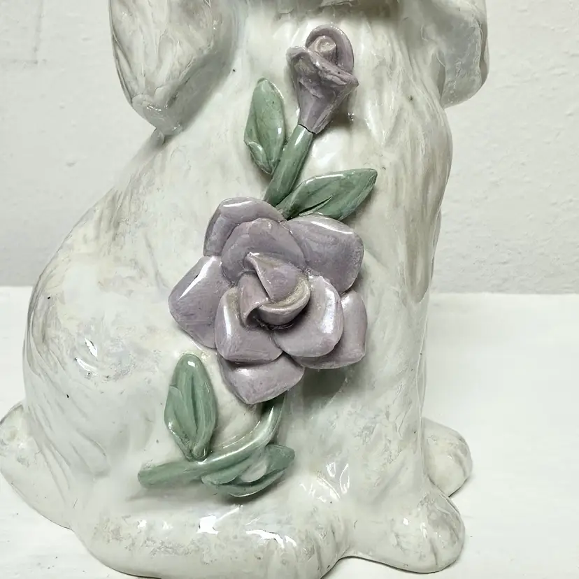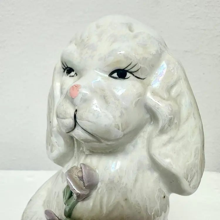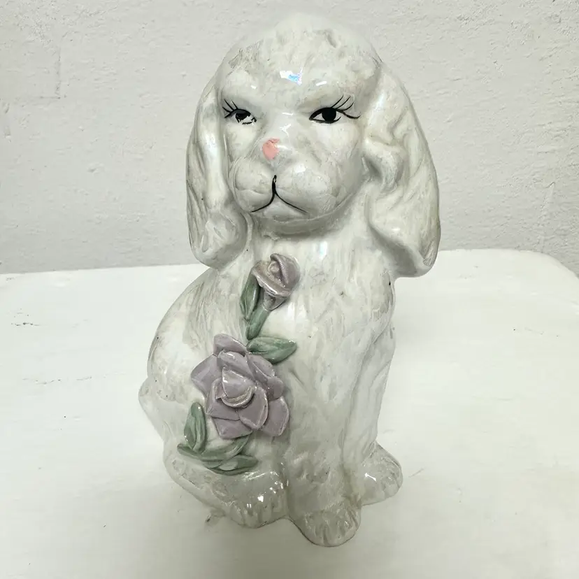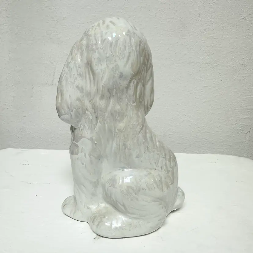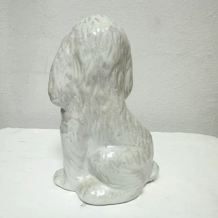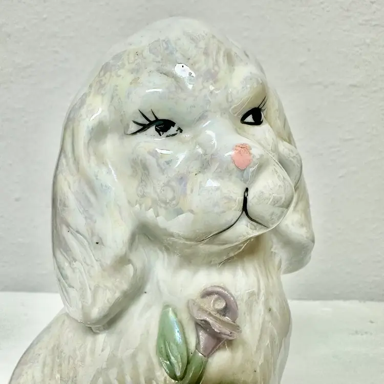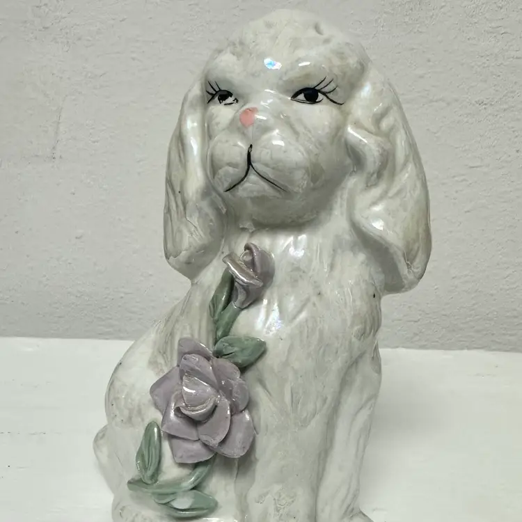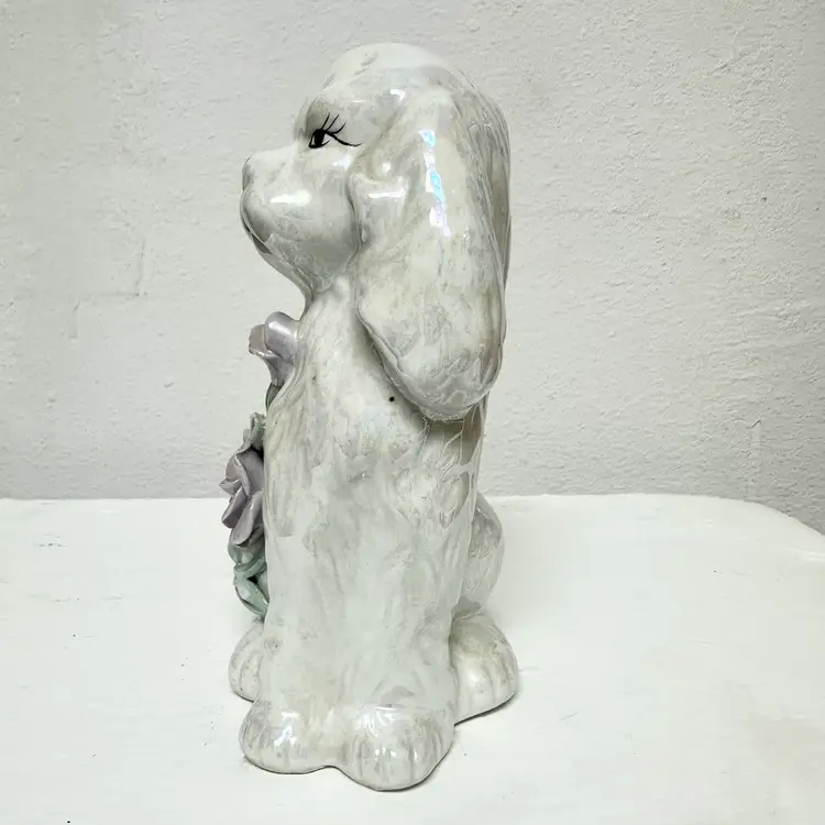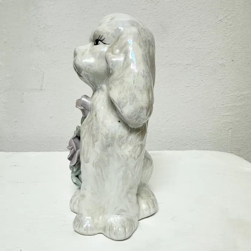 This listing is for this cute Vintage White Lusterware Sitting Dog Figurine. This porcelain figurine is adorned with intricate lusterware purple flowers, adding a touch of whimsy and elegance to any collection.