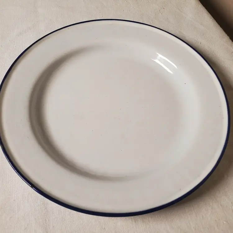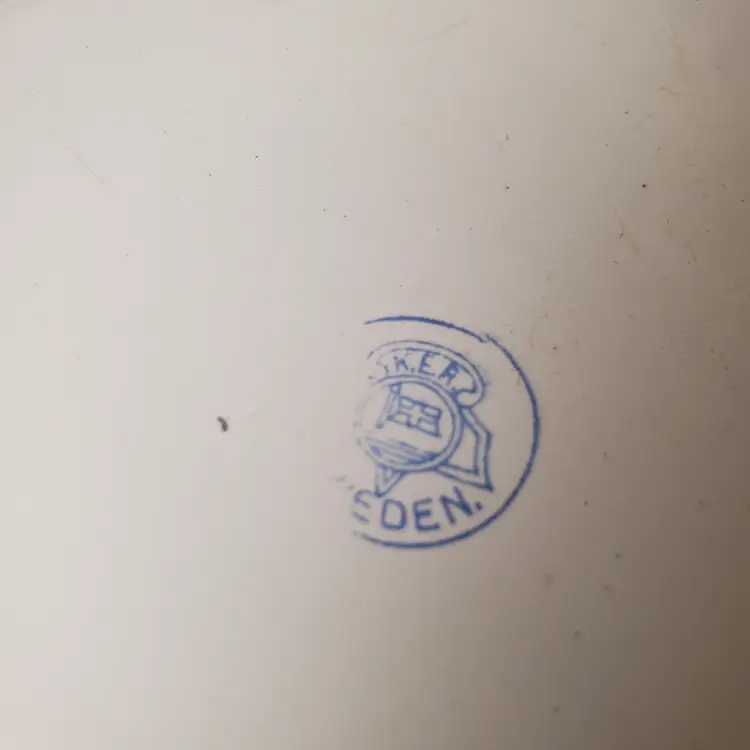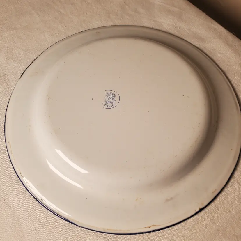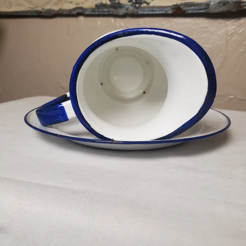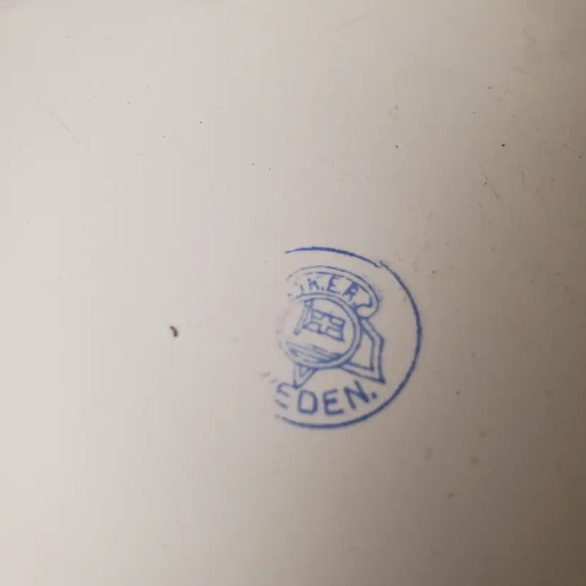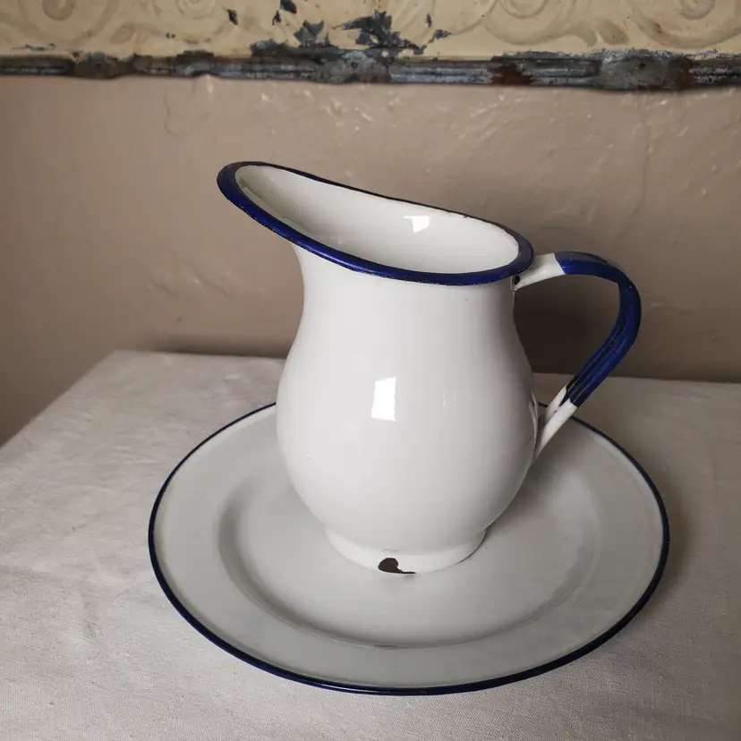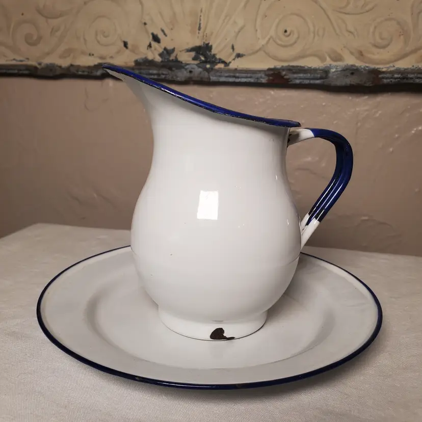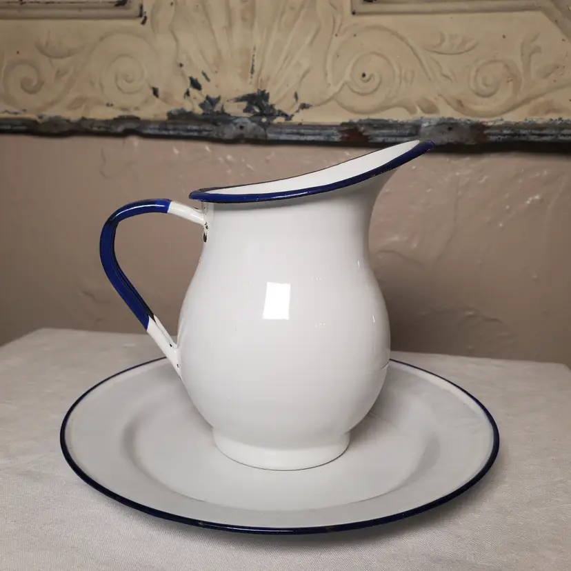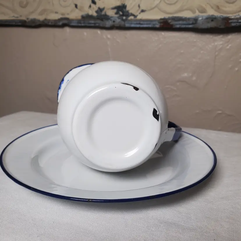 Adorable white with blue trim enamel petite pitcher and saucer. Plate marked K.E.R Sweden, 7" diameter. Pitcher is unmarked, 5 1/4" tall.