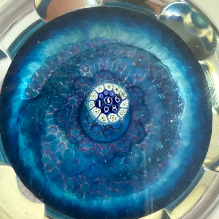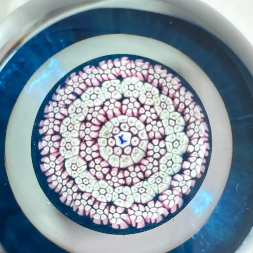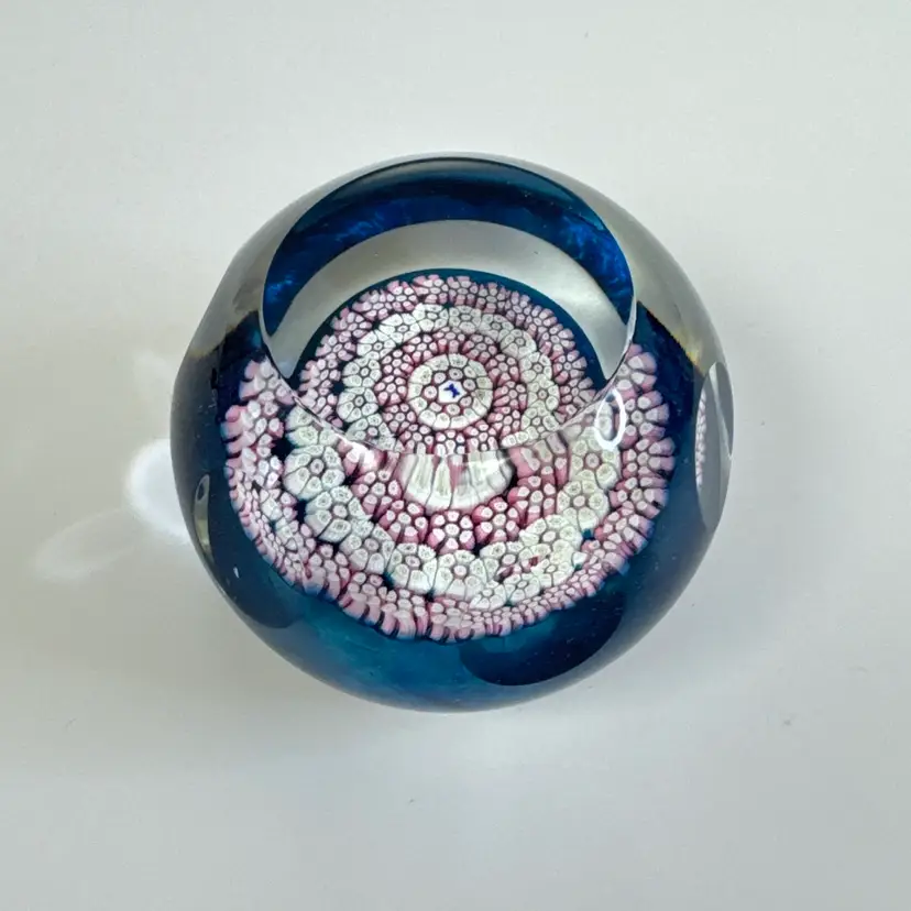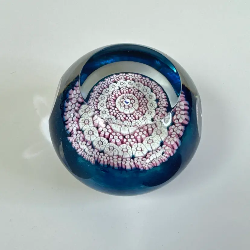 It features rose pink and white millefiori canes on a deep cobalt blue base.