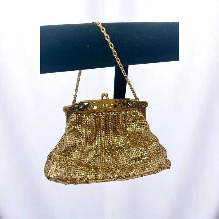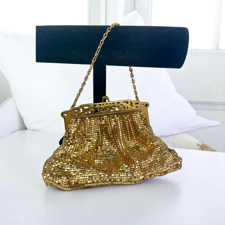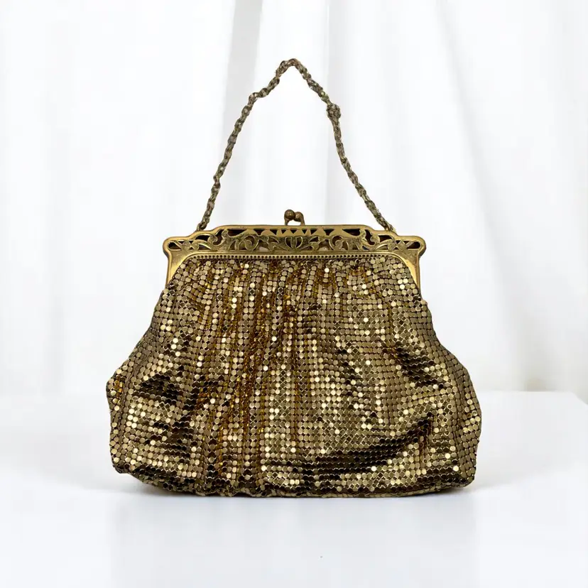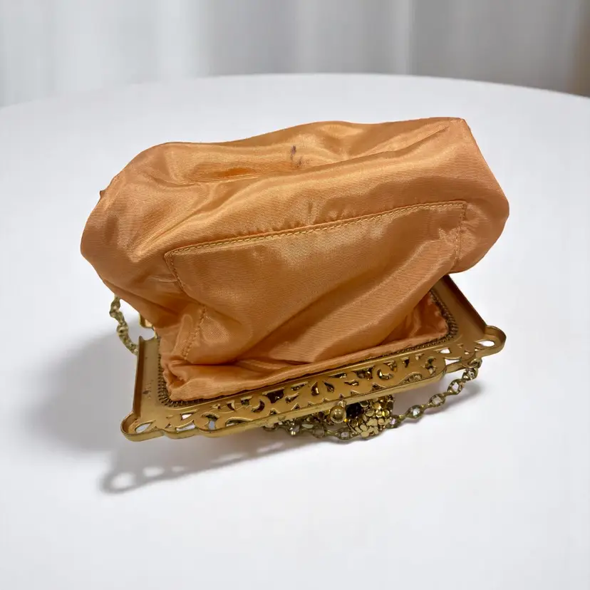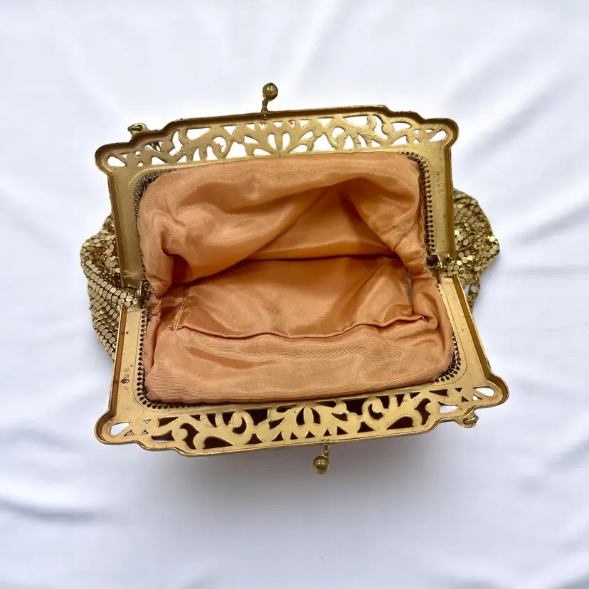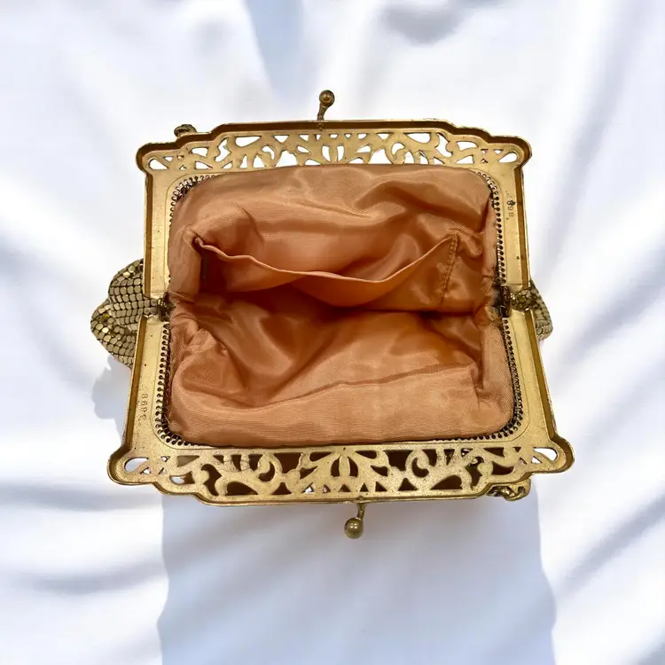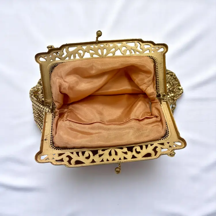 Gorgeous vintage Whiting & Davis gold mesh evening bag with an ornate filigree frame and kiss-lock clasp. Peach satin lining with a small inner pocket.