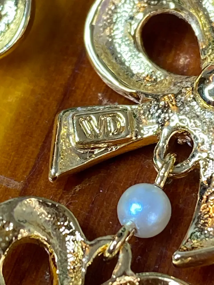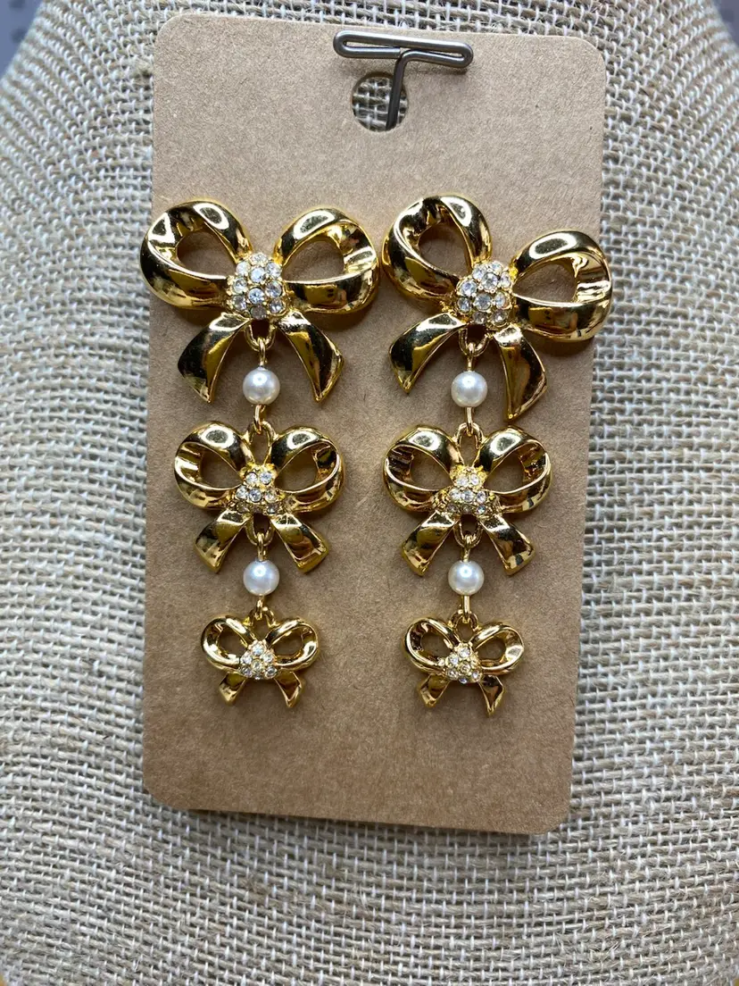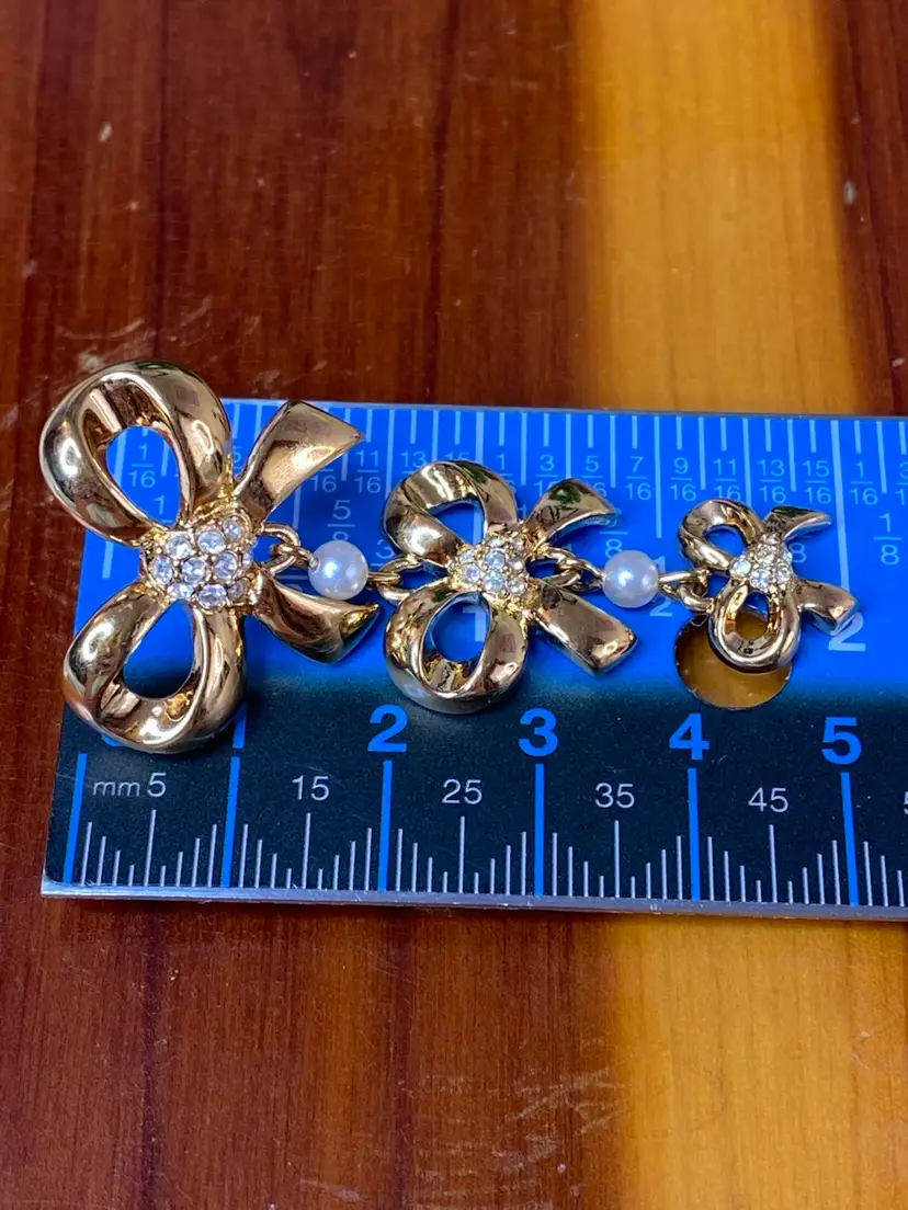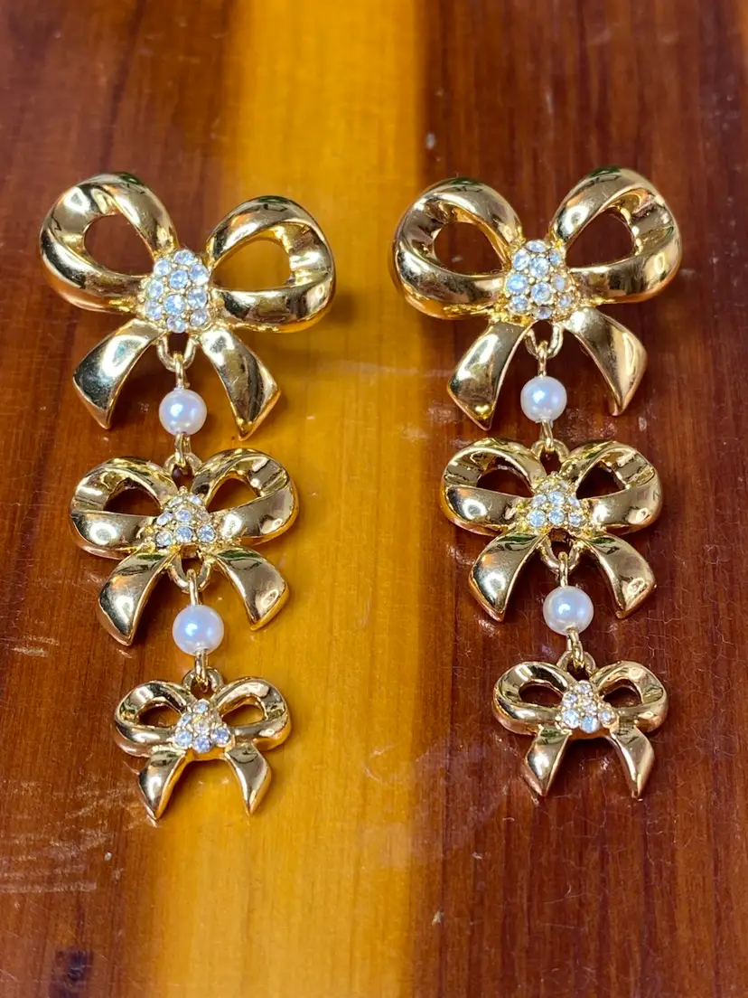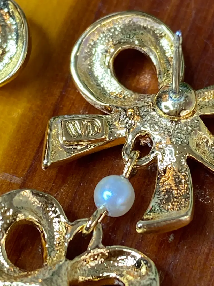 Add a touch of vintage glamour to your outfit with these beautiful Whiting and Davis earrings. The gold-tone metal and faux pearl rhinestone design is perfect for any fashion-conscious individual. The earrings are signed and feature a stunning bow shape, measuring 2 inches in length.