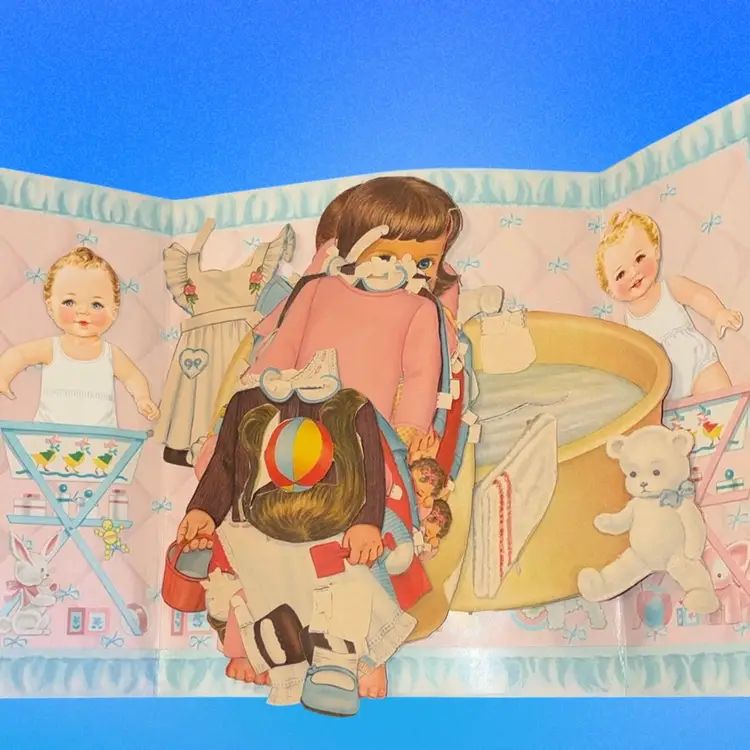 1953 vintage paper doll folder, has 4 babies, and 3 envelopes filled with cut out clothing. I believe the folder is suppose to only have 2 babies but I think they were put all in one.