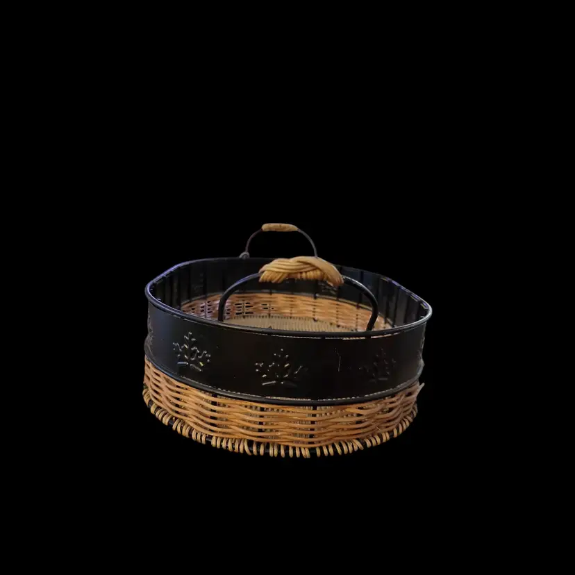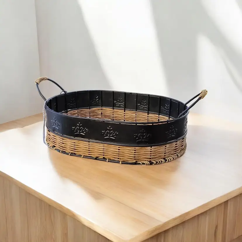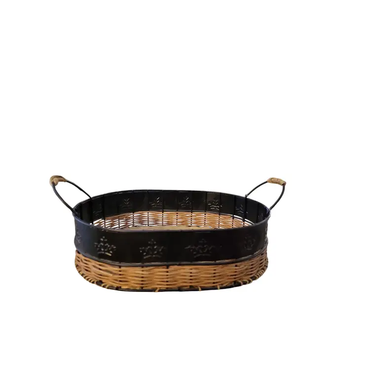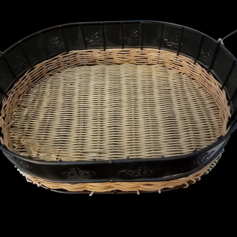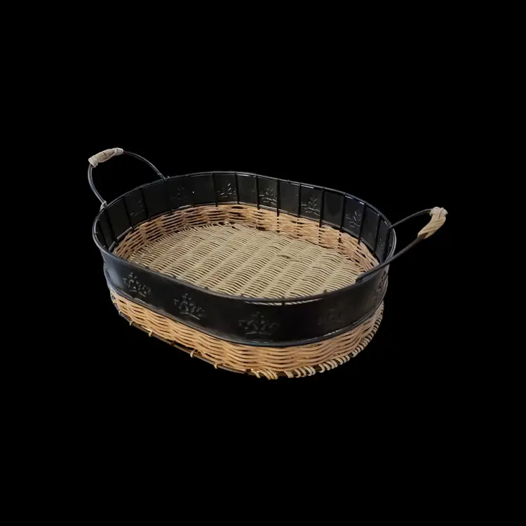 This charming vintage 12" by 9" serving tray combines rustic wicker/rattan with sturdy metal for a unique look. The oval shape and convenient handles make it perfect for serving snacks or displaying decor. Ideal for adding a touch of vintage flair to your kitchen or dining room.