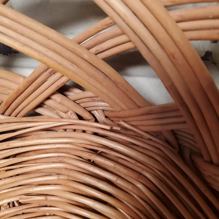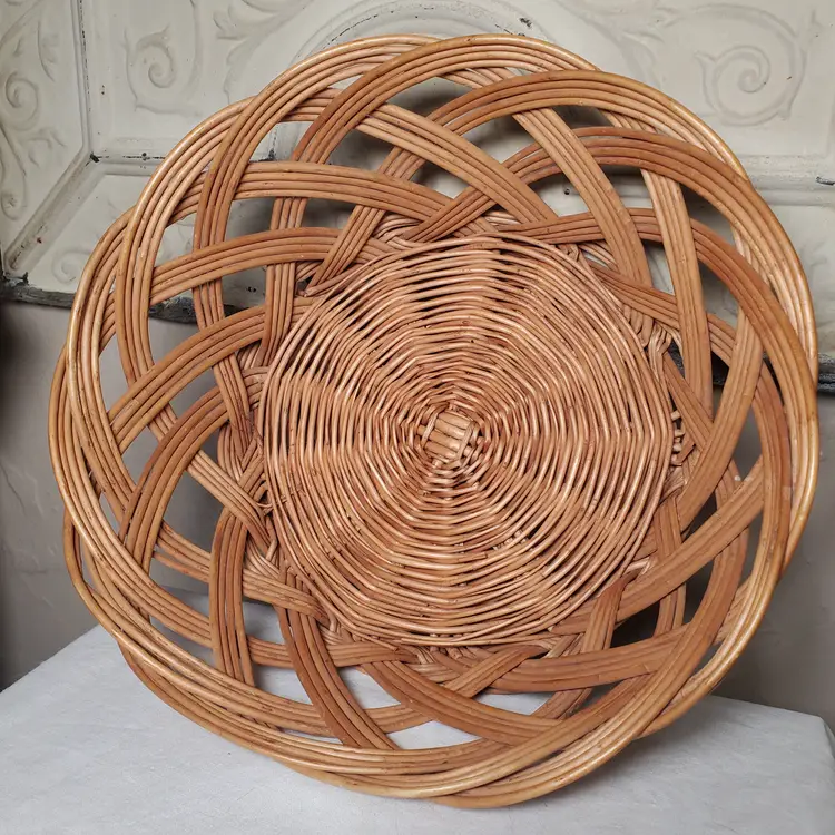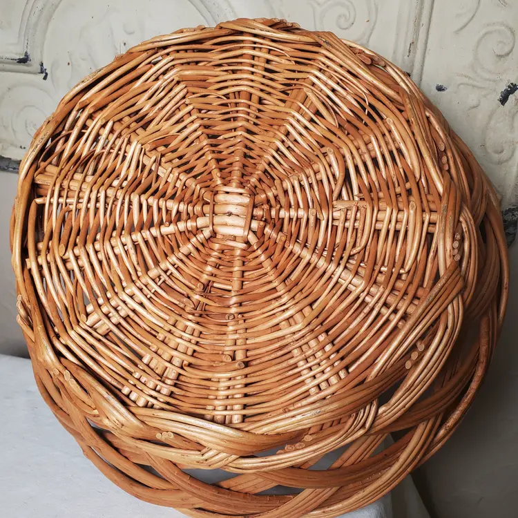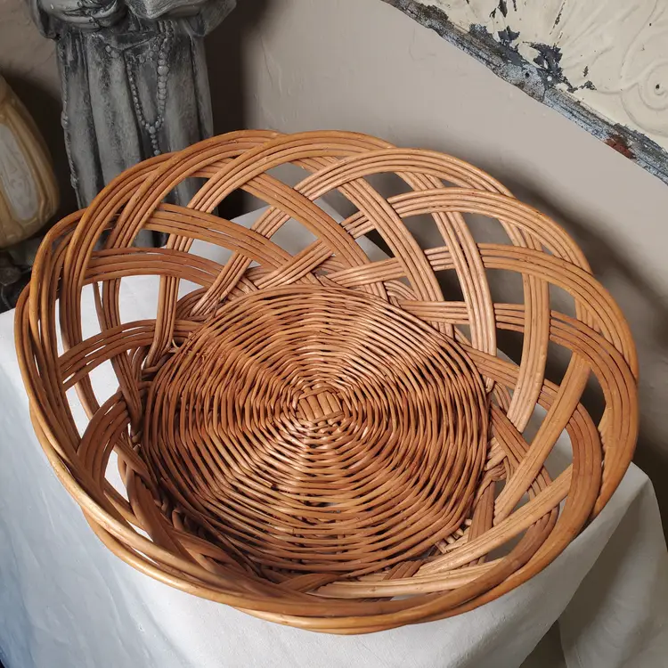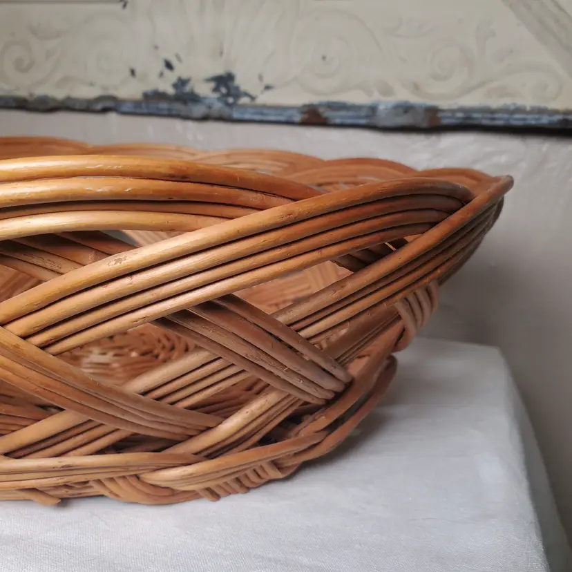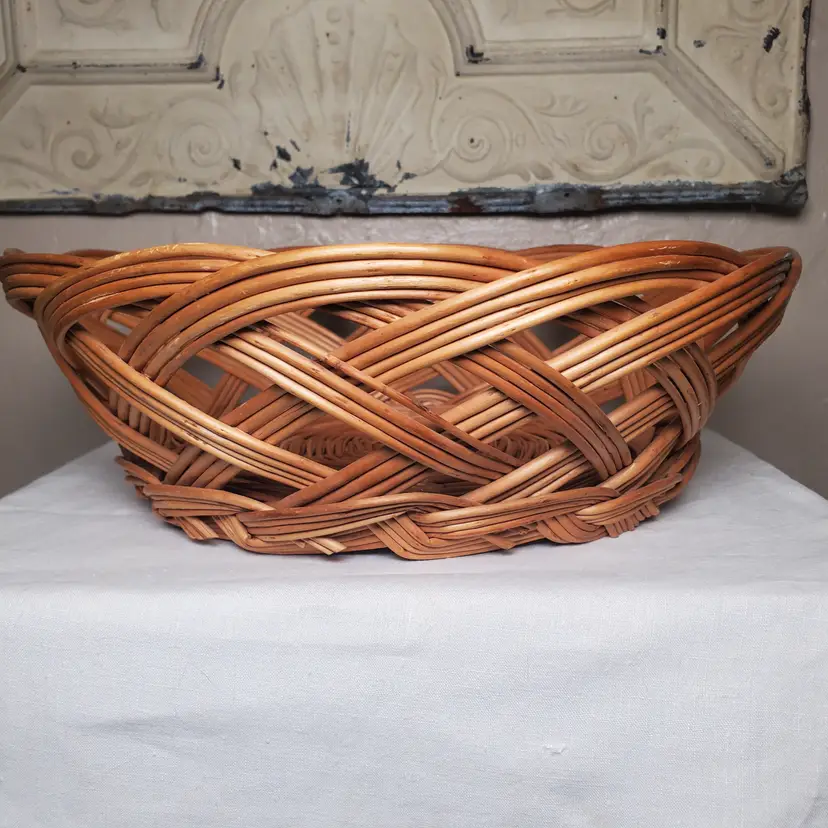 This is a vintage wicker basket that is great for any tabletop use---decorative or functional. 12 1/2" diameter. In great vintage condition with no worn fibers or stains, and one small broken strand as shown
