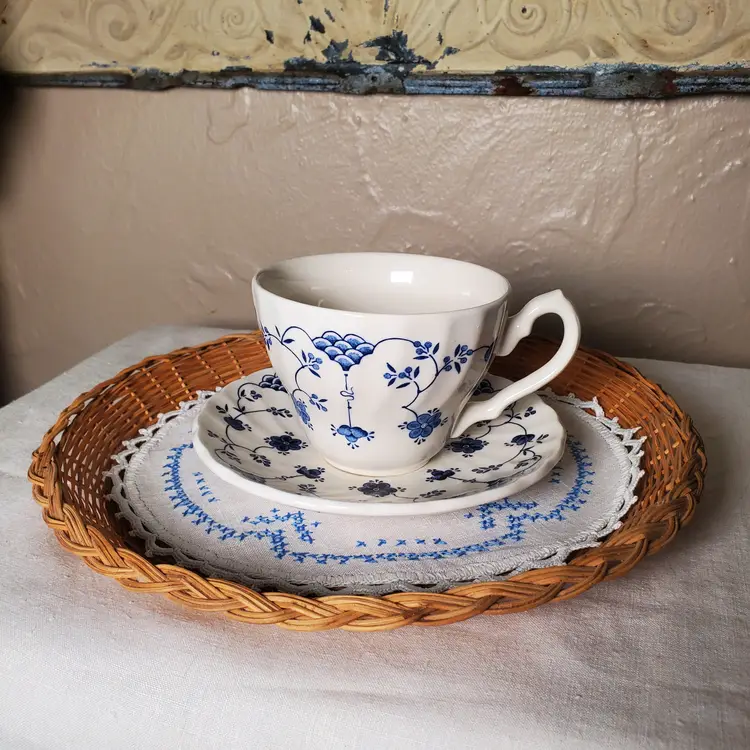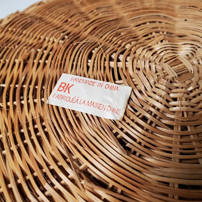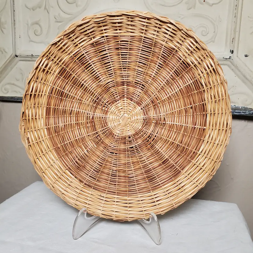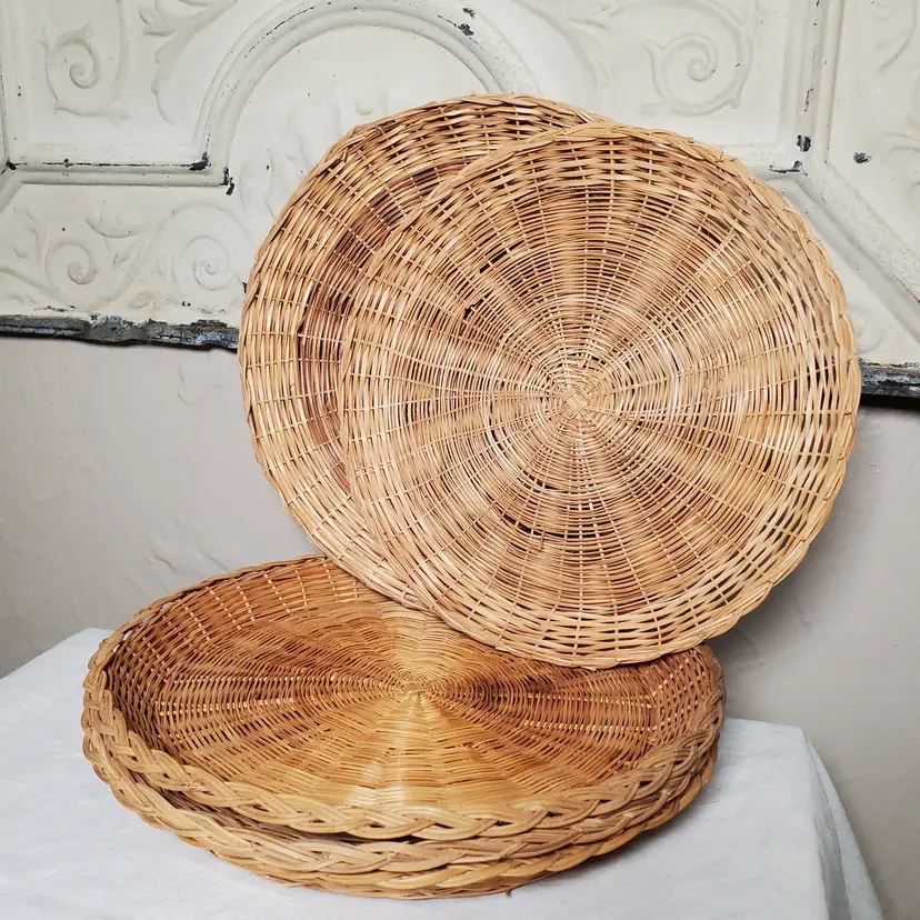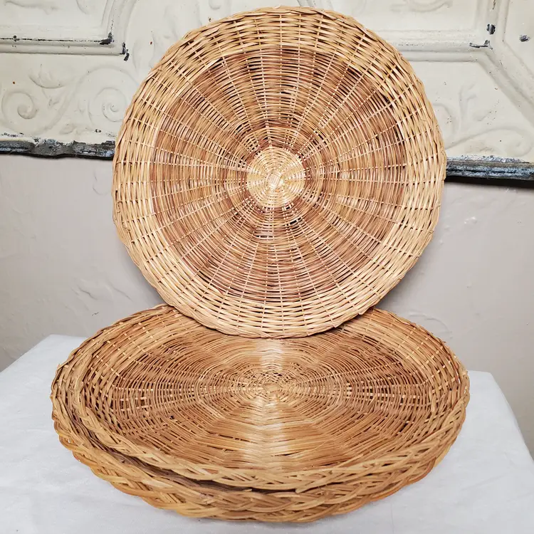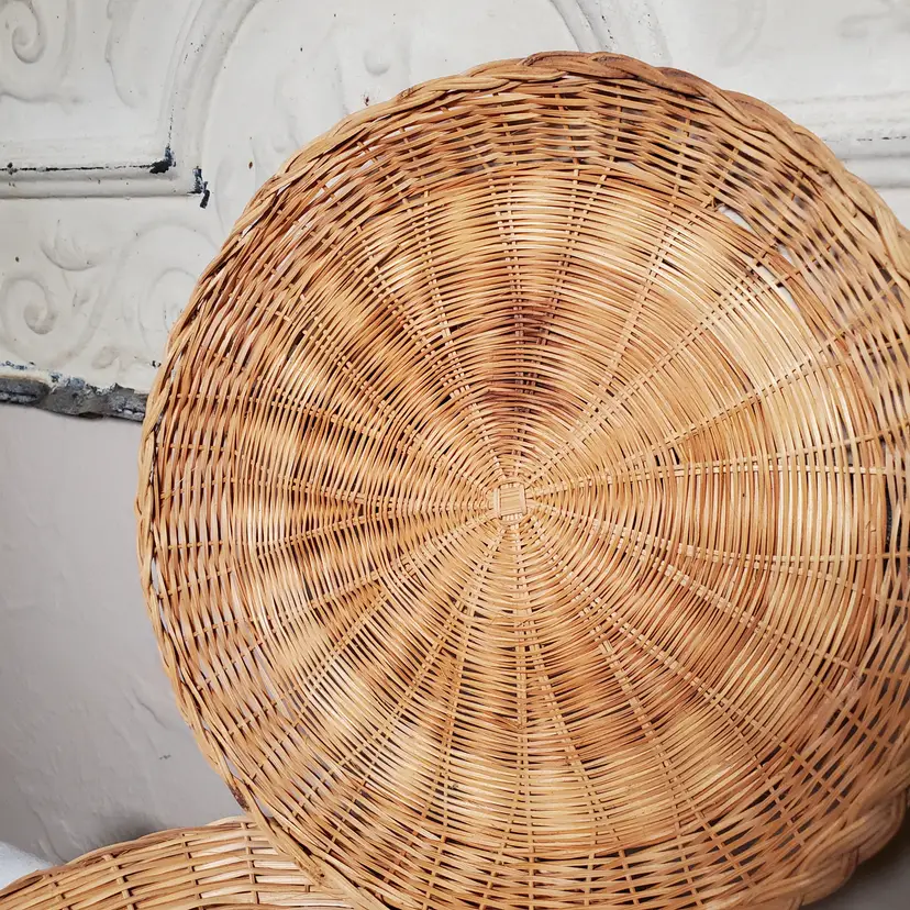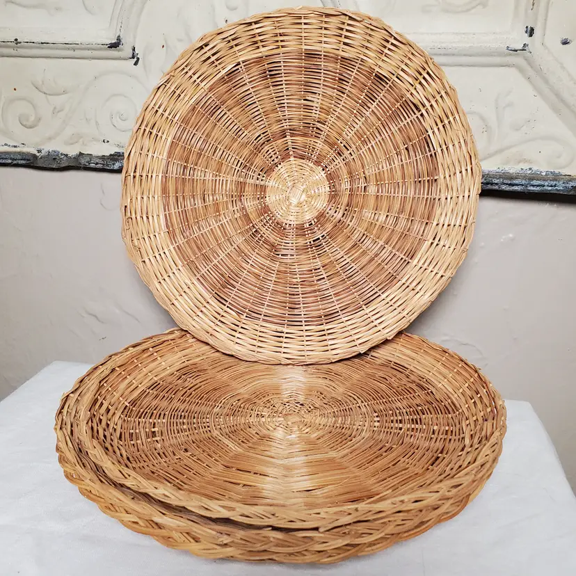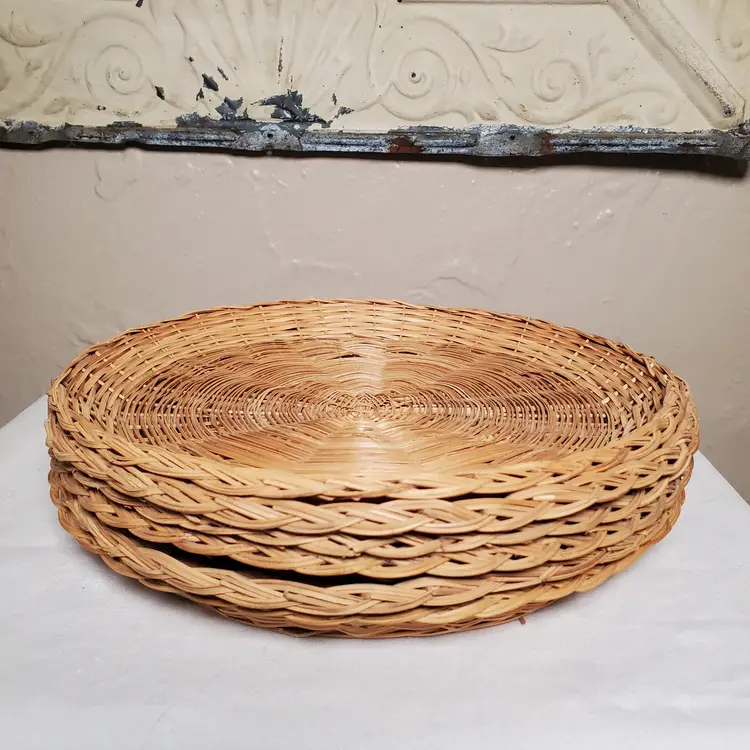 While these were originally intended as paper plate holders to keep those flimsy plates solid, I love them as chargers for a salad or dessert plate or cup & saucer. See last photo. I think they would also look great on a decorative plate wall. This is a set of six in very good vintage condition with some variance in wicker color from both maker and use. 9 3/4" diameter.