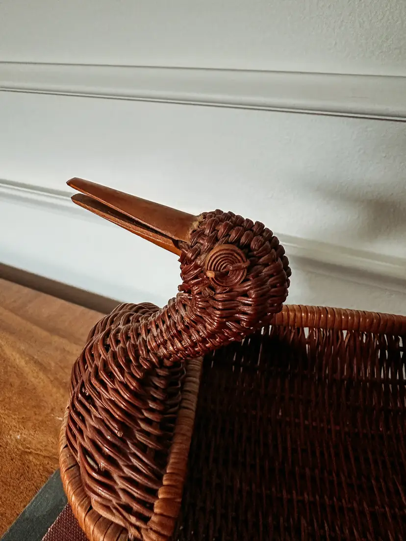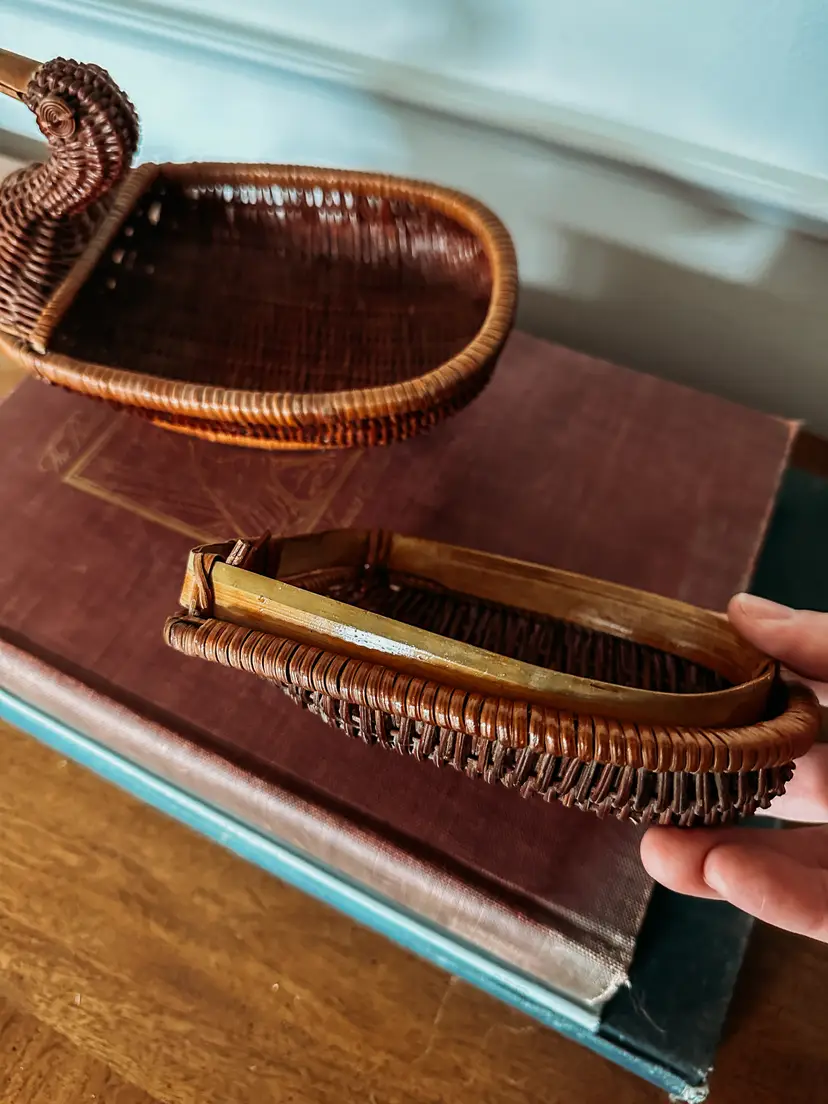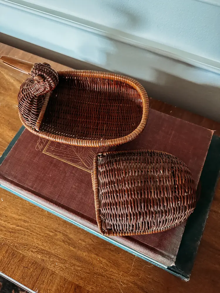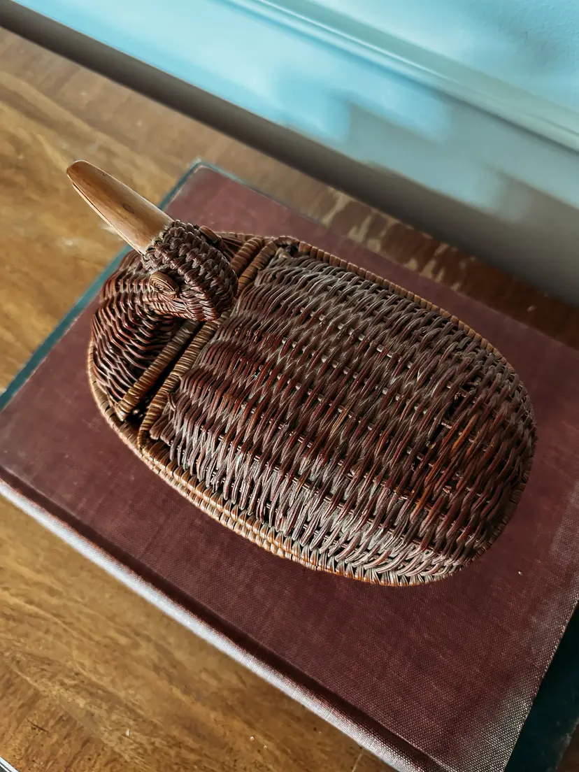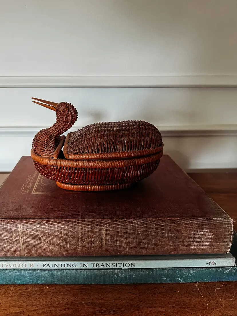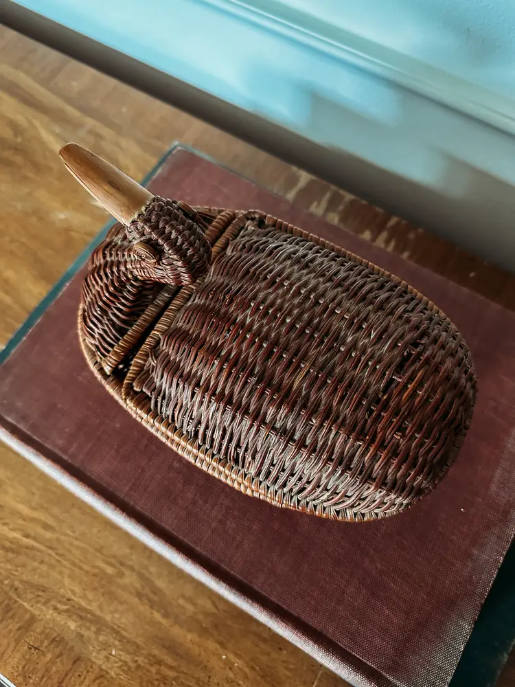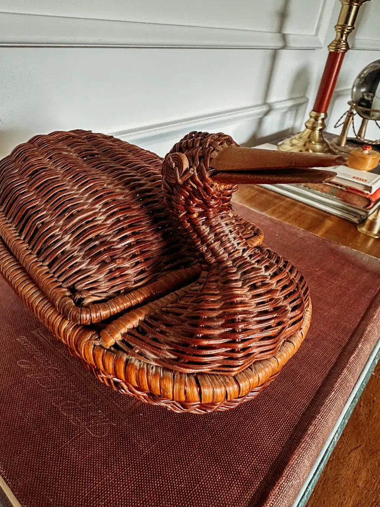 These cuties never last long in my shop! I love that this duck has his neck pulled back! The lid has a lip on it to keep it securely closed which I've never seen before! Wooden beak and 2 eyes make this so charming! Not quite 9" long
