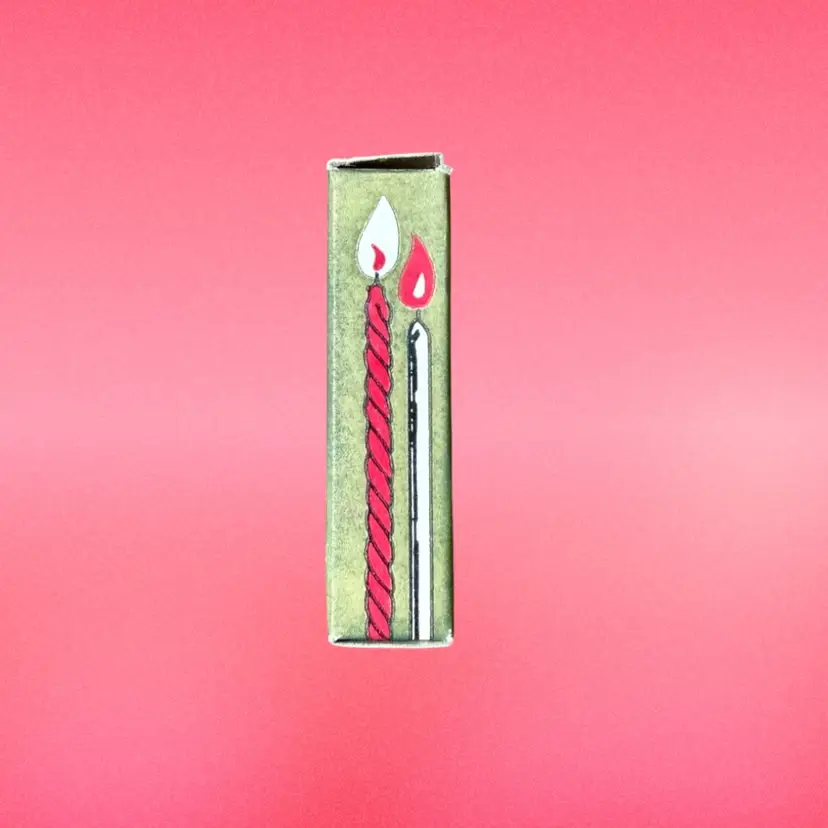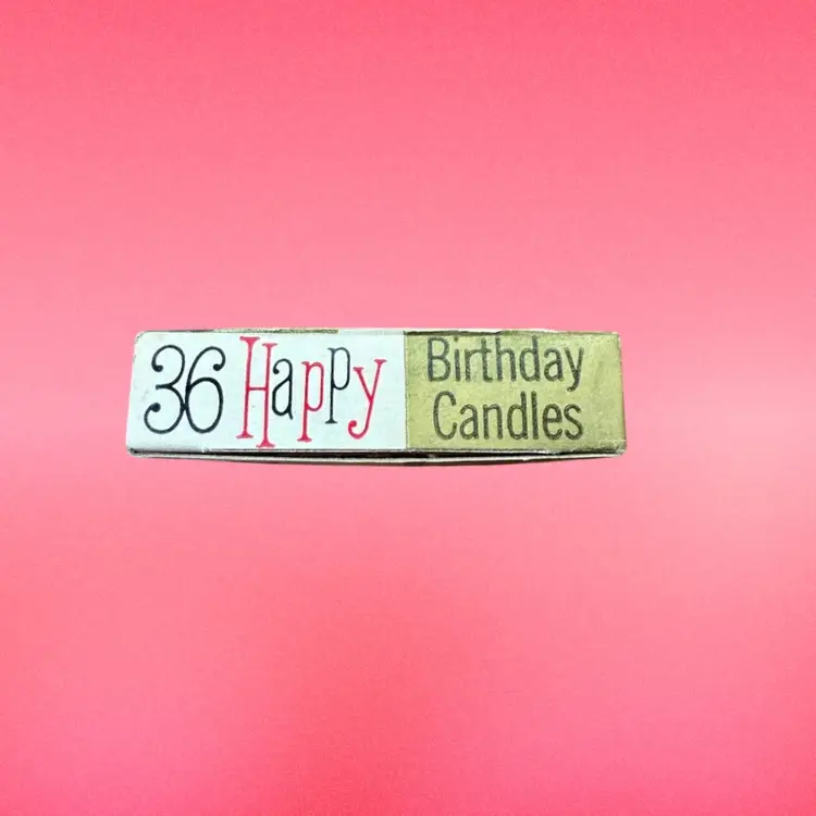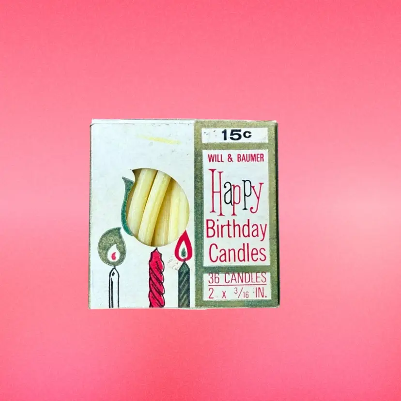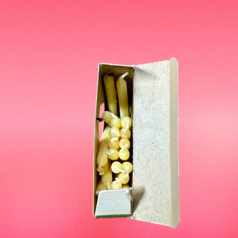 Candles are 2”x3/16”. There are 21 candles in box, 2 have been lit. Some wear on box from age, but a good box with fun graphics for a display!